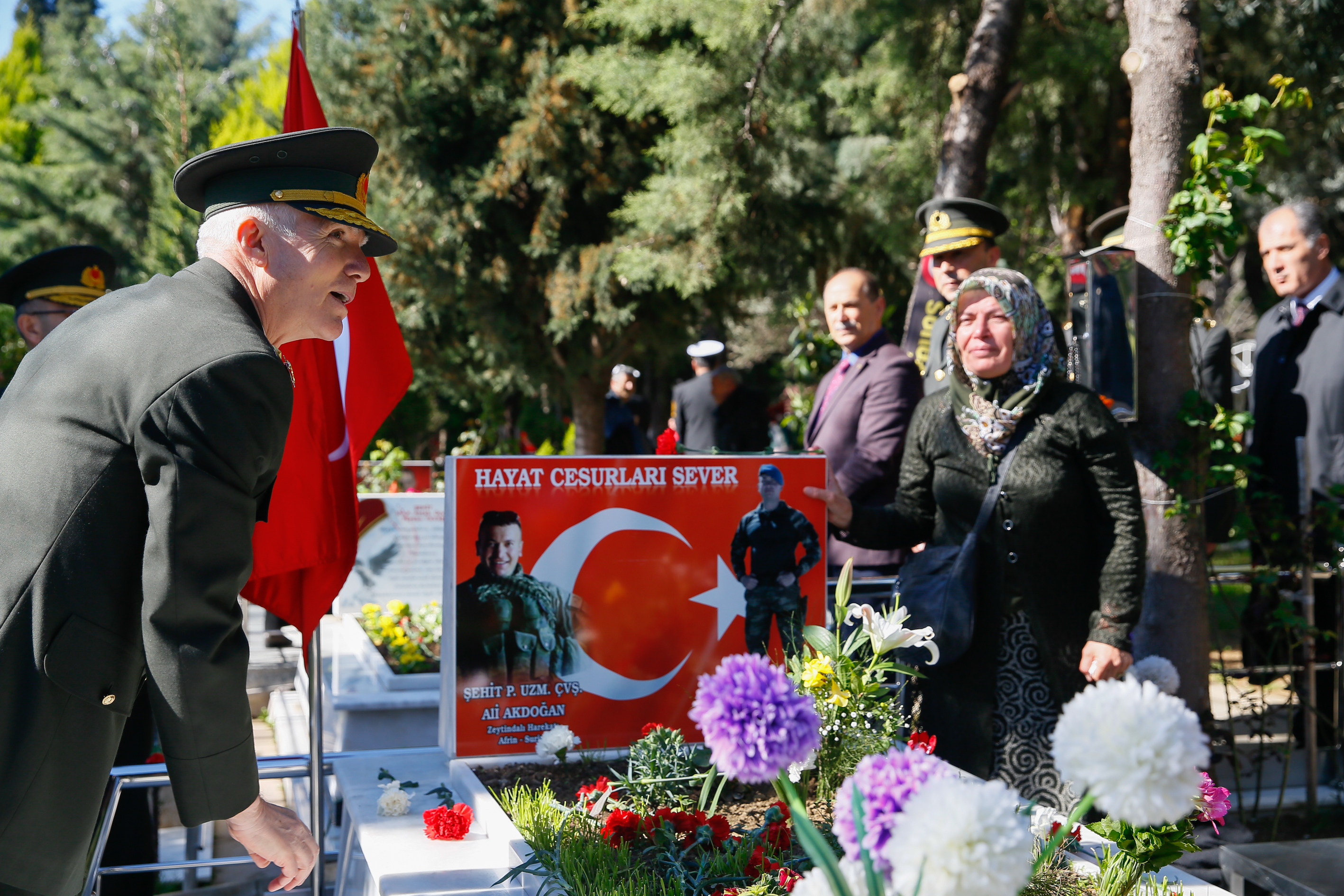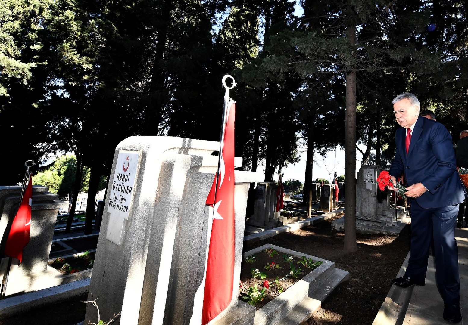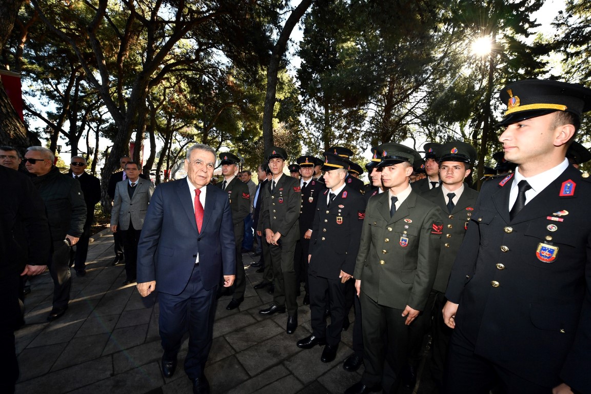 İzmir İl Müftsüsü Recep Şükrü Balkan’ın duasın ın ardından İzmir Valisi Erol Ayyıldız, Ege Ordusu ve Garnizon Komutanı Abdullah Recep ve İzmir Büyükşehir Belediye Başkanı Aziz Kocaoğlu, şehit mezarlarını ziyaret ederek karanfil bıraktı.