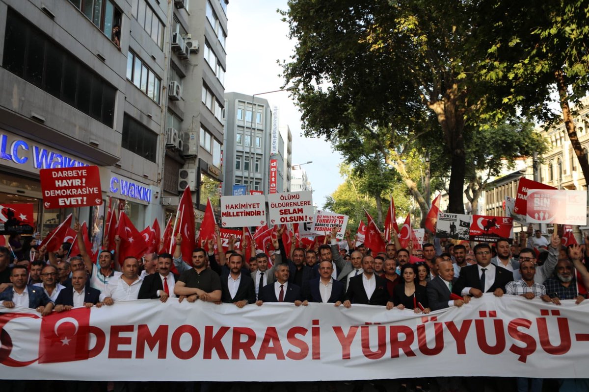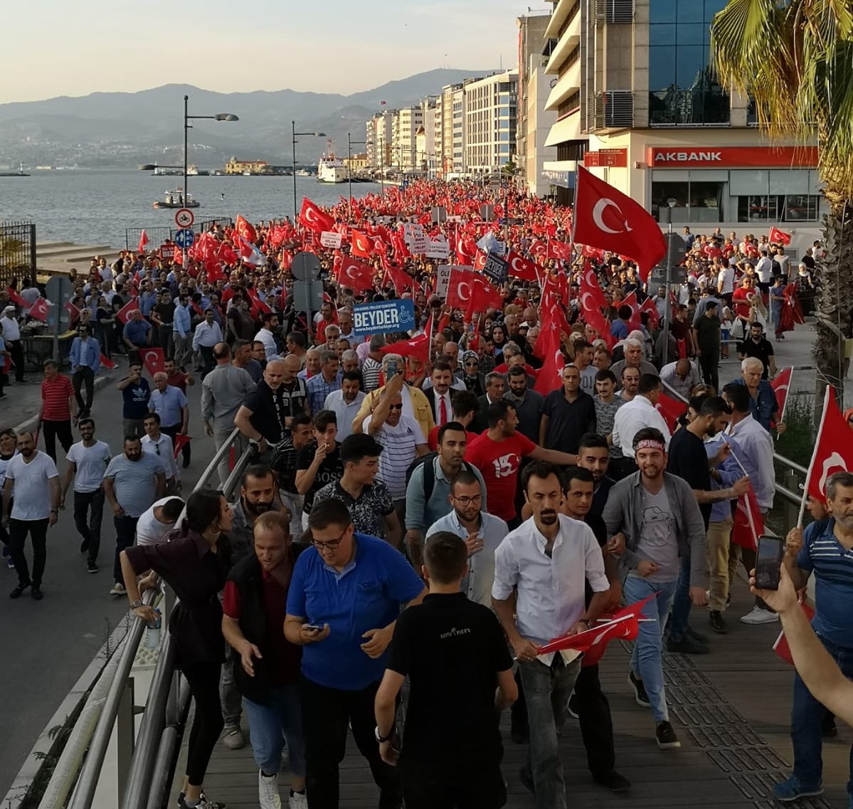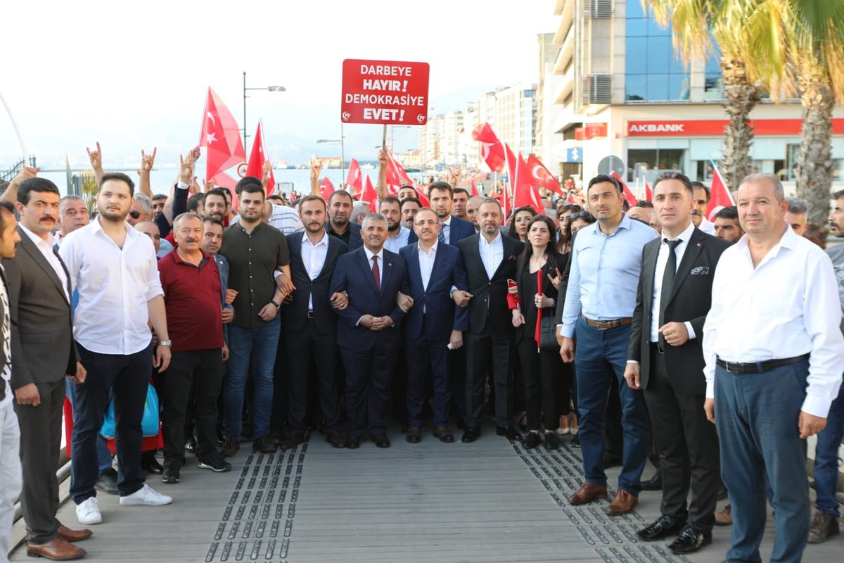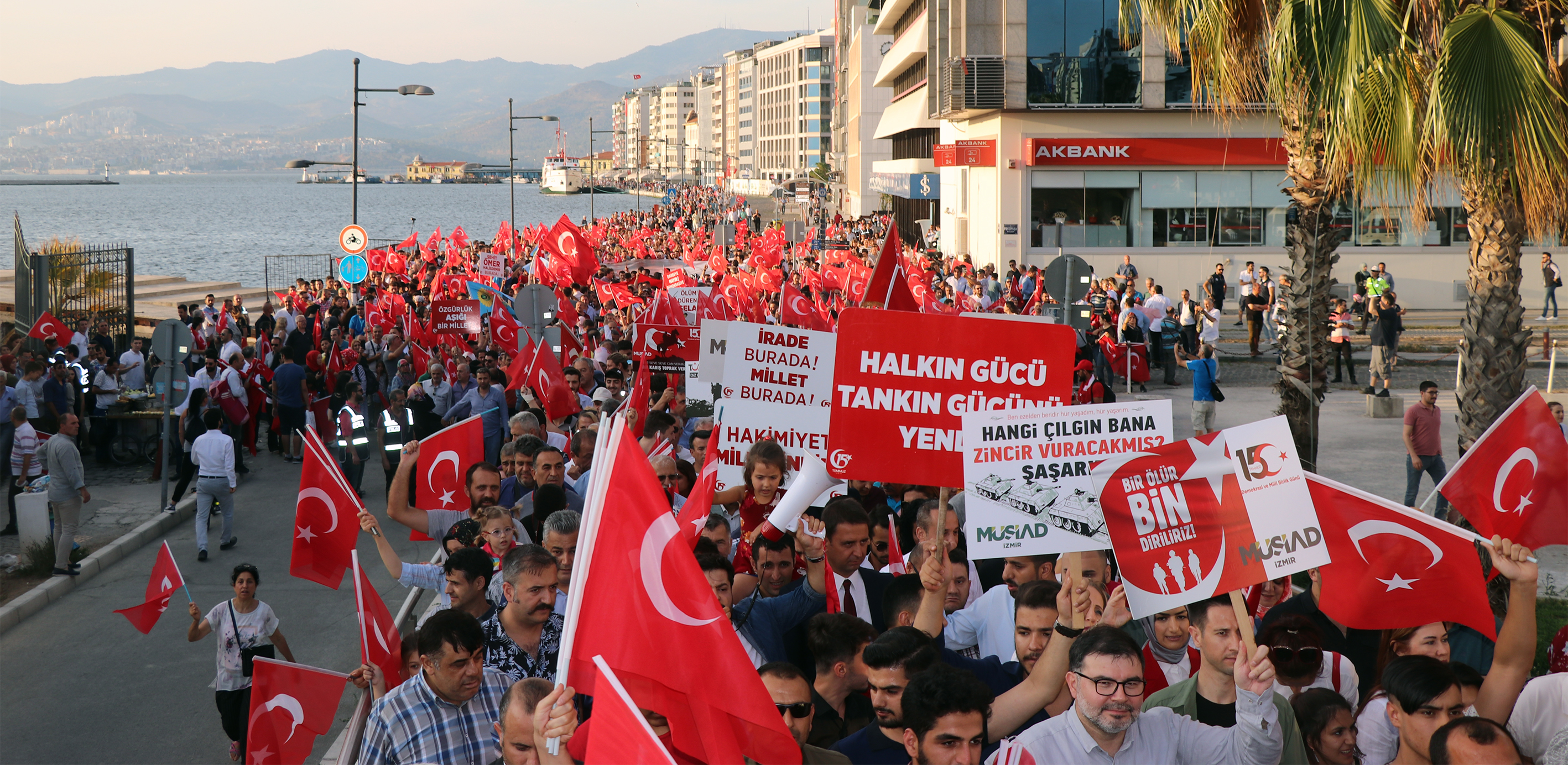 Basmane Meydanı'nda başlayan yürüyüşe protokol üyelerinin yanı sıra vatandaşlar da eşlik etti. Türk bayrağı taşıyan vatandaşlar, "Darbeye hayır, demokrasiye evet", "Öleceksek adam gibi ölelim", "Şehitler ölmez, vatan bölünmez" yazılı pankart açtı.