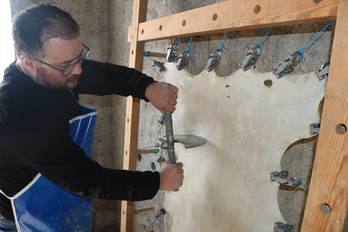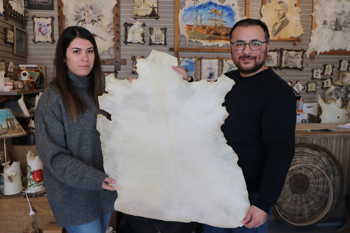 Tabakhaneden aldıkları oğlak derilerini 10 gün kireçli suda beklettiklerini, kavaleta bıçağıyla üzerindeki tüyleri sıyırdıklarını anlatan Demirel, çerçeveye gerdikleri deriyi inceltme bıçağıyla kazıyarak parşömen haline getirdiklerini anlattı.