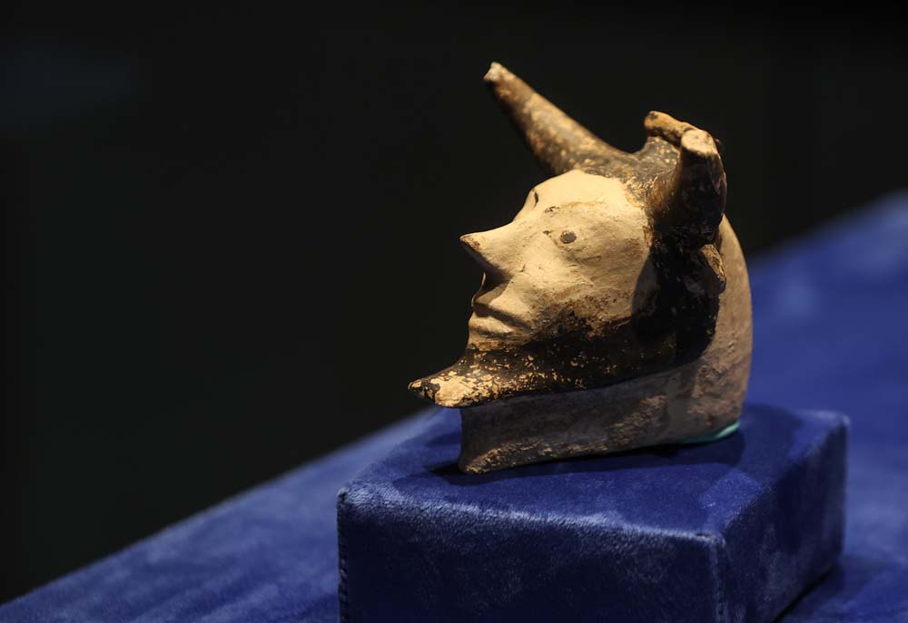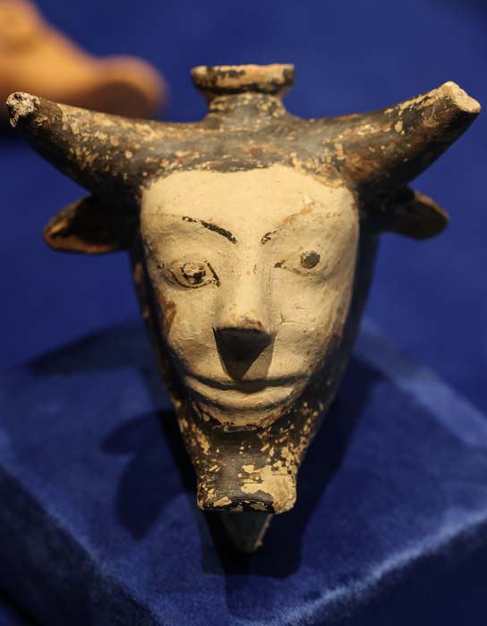 Keser, eserlerden ilkinin boynuzlu ve sakallı erkek başı şeklinde biçimlendirilmiş bir parfüm ya da yağ şişesi olduğuna dikkati çekerek, eserin kalkık kaşlar, yayvan ağız ve gülümsemesiyle Yunan nehir tanrısı Achelous'u betimlediğini kaydetti.