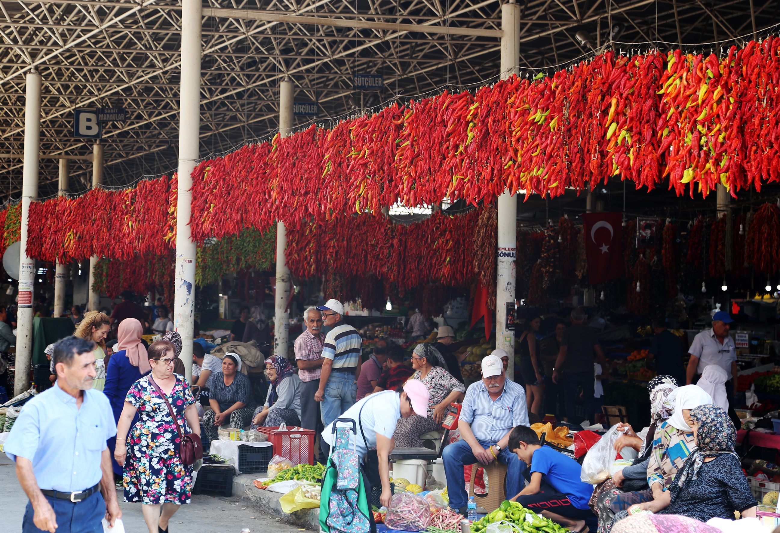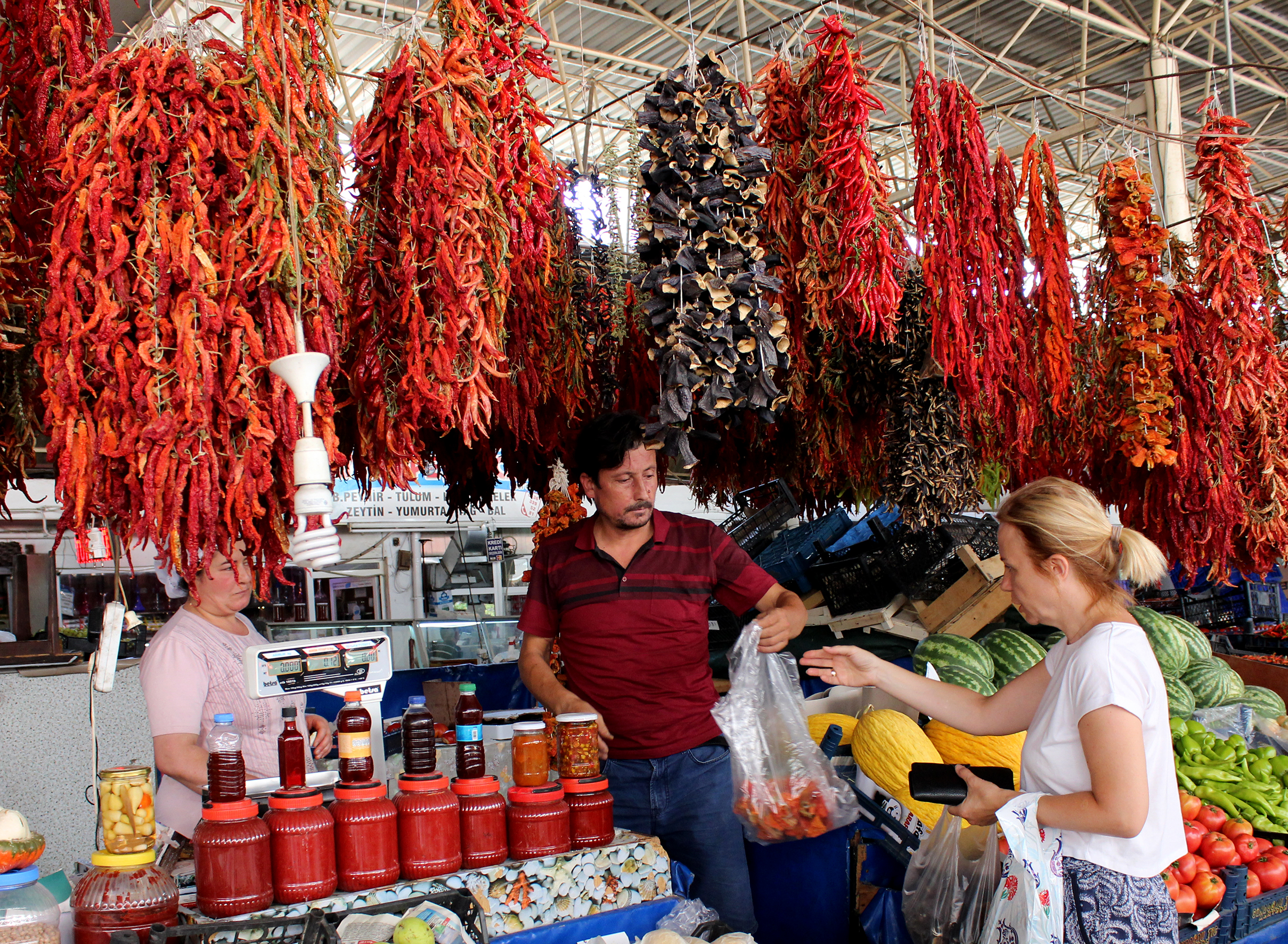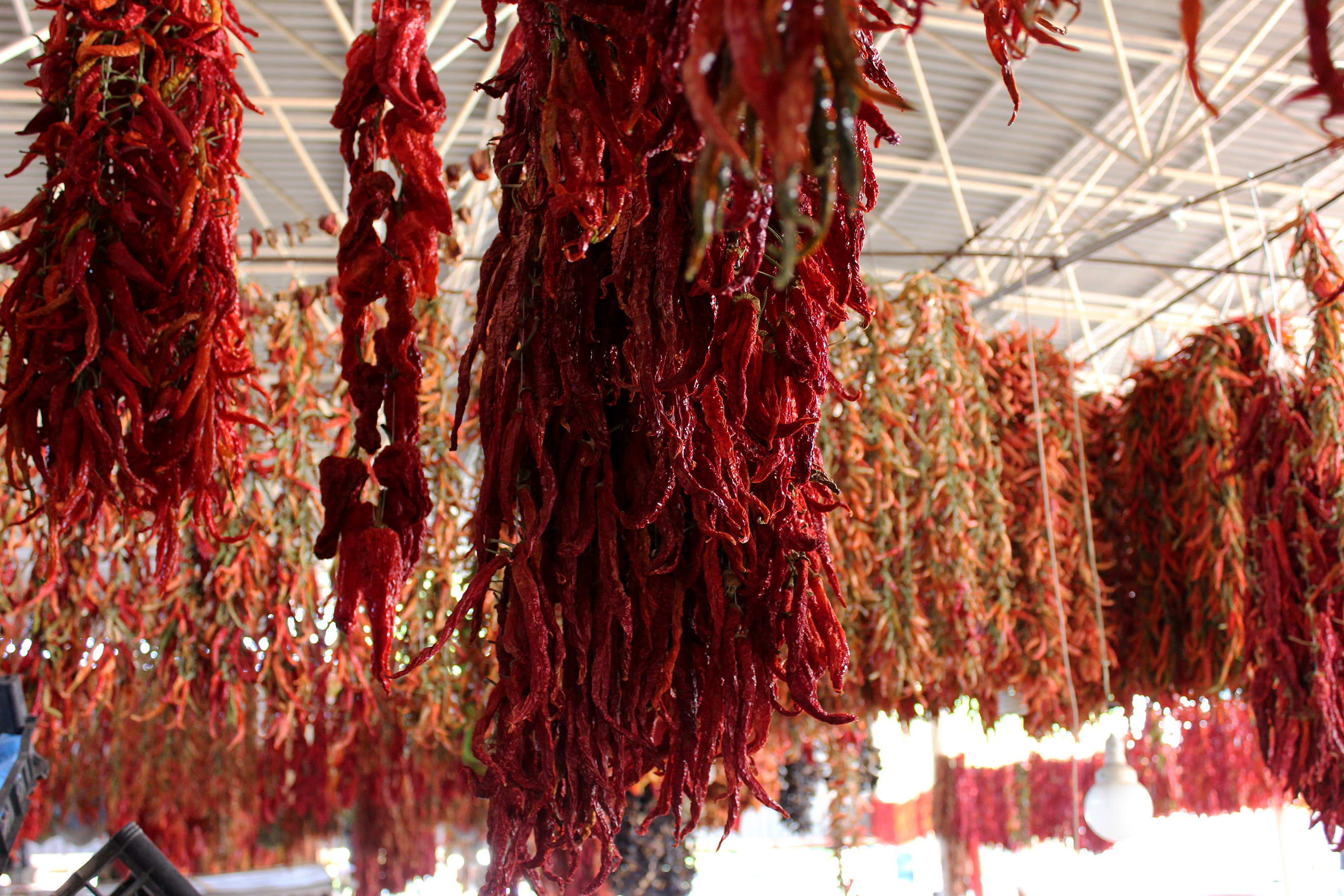 Menteşe ilçesinde açık pazar yerinde ipe dizildikten sonra çelik konstrüksiyondan yapılan çatıya asılarak kurutulan kırmızı biber, internet üzerinden de sipariş ediliyor.