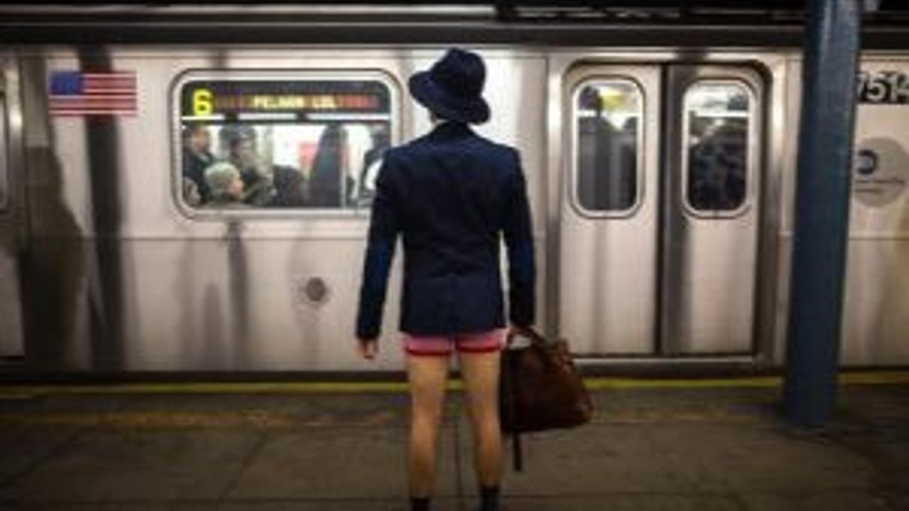 12 Ocak 2014, New York'ta 'Metroya Pantolonsuz Binelim' organizasyonundan bir katılımcı.