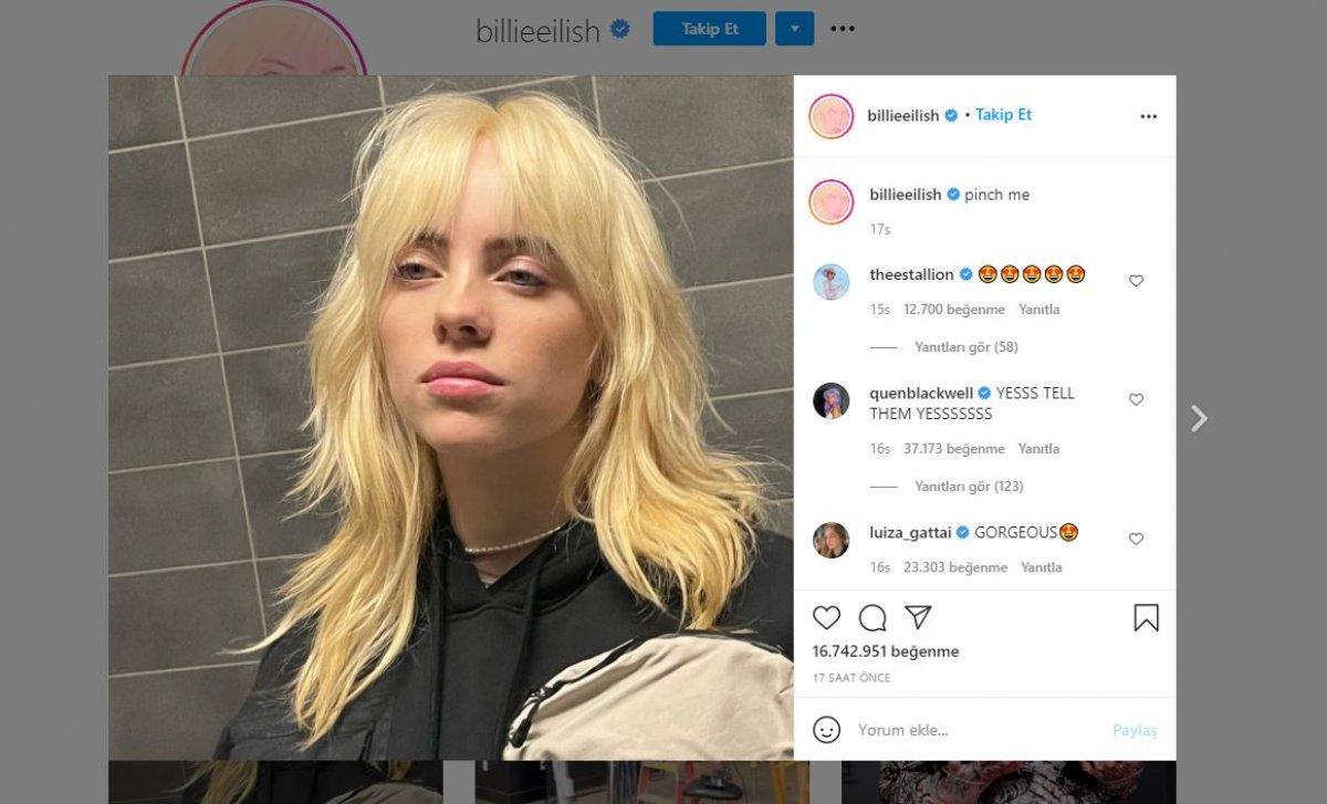 4. Billie Eilish: 17 Mart’ta yaptığı paylaşımda şarkıcı, portre fotoğrafının altına sadece “Beni çimdikleyin” diye yazdı, 23 milyon beğeni aldı.