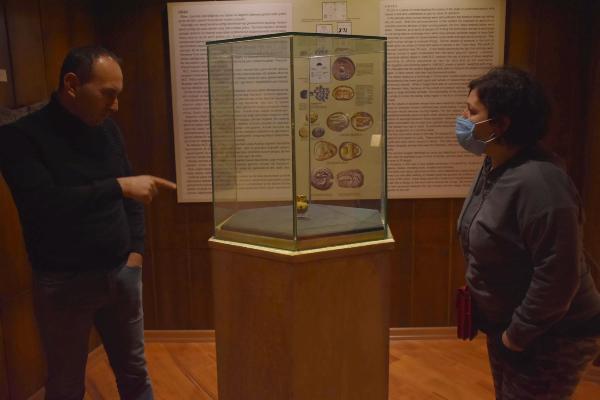 Sergilenen eserlerle ilgili bilgi veren İzmir Müze Müdürü Hünkar Keser, "1995 yılı Baklatepe kazısında bulunmuş bir kap. Erken Tunç çağı dönemine ait, 5 bin yıl önce üretilmiş insan yüzlü bir kap. Kabımız kadın formunda yapılmış. Koruyucu özellikleri olan ana tanrıçayı temsil eden pişmiş topraktan yapılmış. Mezar hediyesi olarak kullanılmış. Öteki dünyada kötü ruhlardan korunmak için, mezarlara konulmuş.