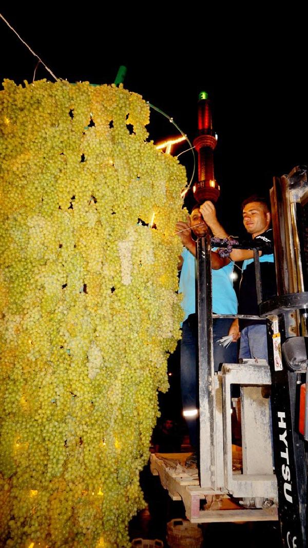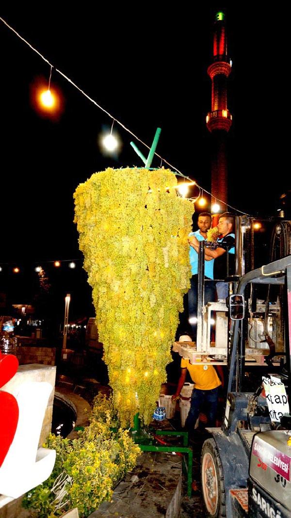 800 kilogramlık yaş sultaniye üzümlerinden oluşturulan 4 metre boyunda anıt, gece görülebilsin diye aydınlatıldı. Belediye Meydanı'nın önüne yerleştirilen dev salkım, görenlerin ilgisini çekti.