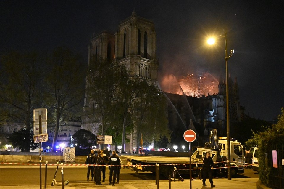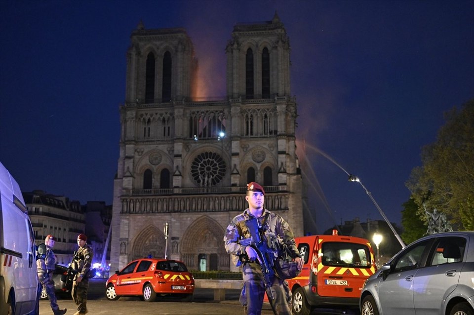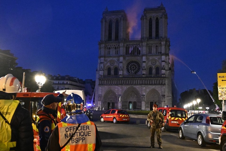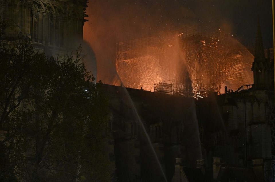 Yerel saatle 18.50'de başlayan yangında 93 metre yüksekliğindeki kulelerden biri ve yapının çatısı tamamen çöktü. Yaklaşık 500 itfaiyecinin müdahale ettiği yangında, yoğun çalışma sayesinde kuzey çan kulesi ile ana bina kurtarıldı.