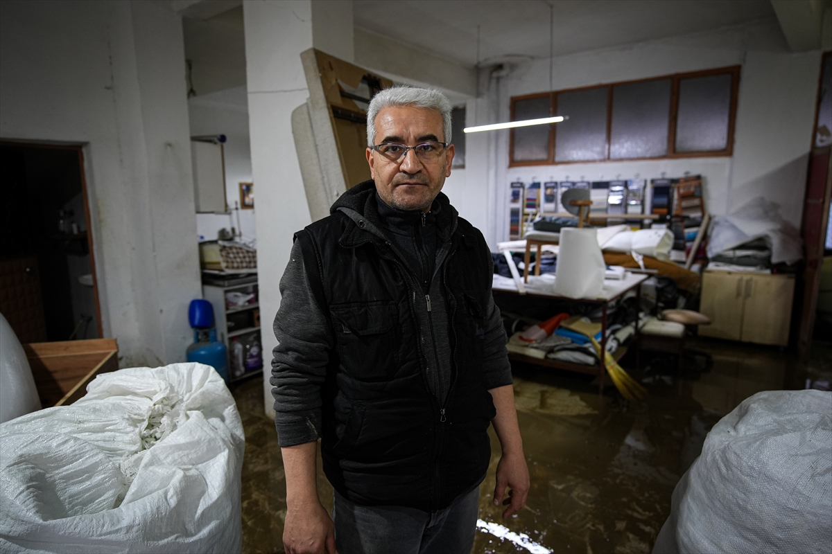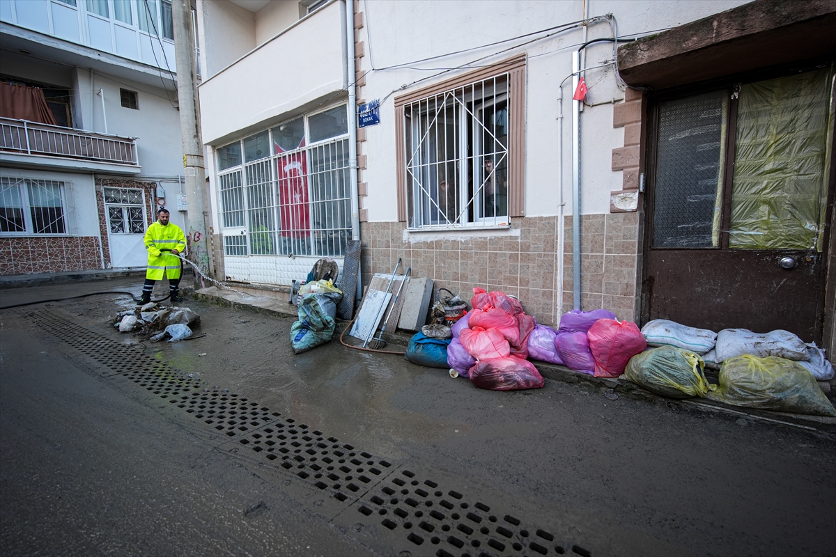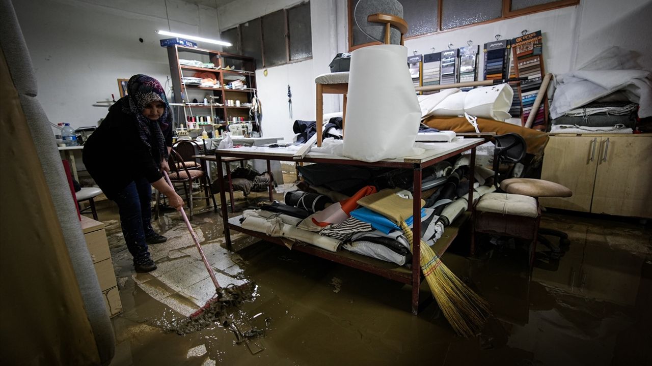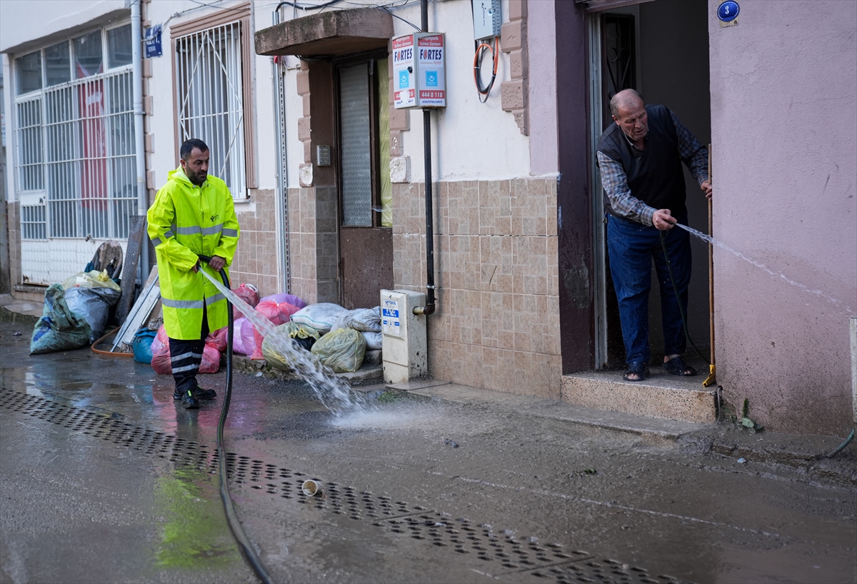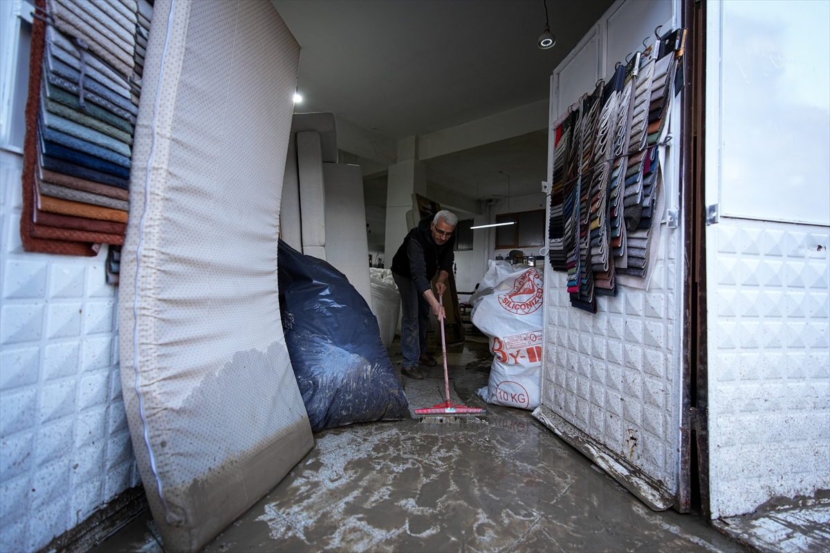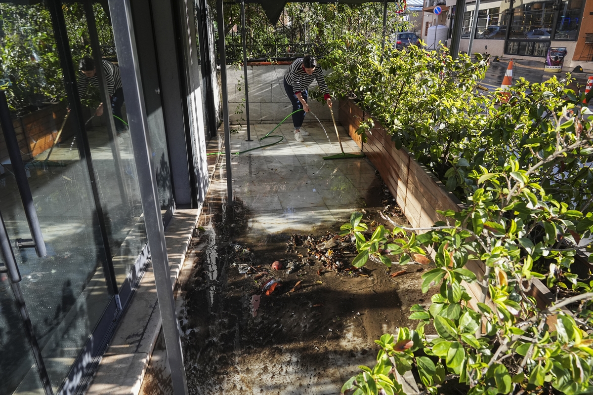 Gece boyunca yağmur sularıyla mücadele eden vatandaşlar, günün aydınlanmasıyla birlikte temizliğe başladı.