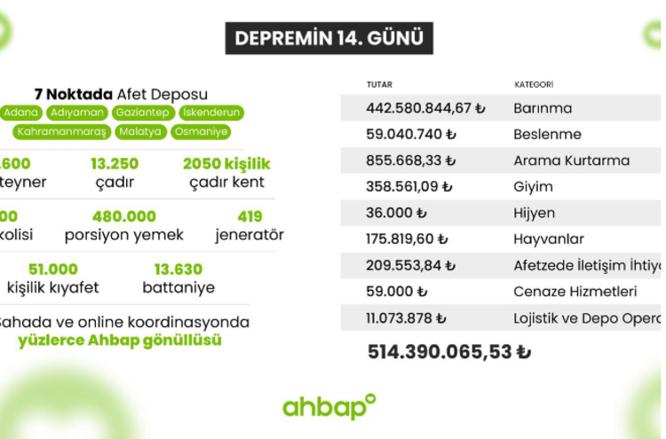 "Ahbaplar şu ana kadar 504 milyon TL harcama yapmış. TÜRMOB ile yapılan faaliyetlerle ilgili öncelikle 06.02.2023-28.02.2023 tarihlerini kapsayan döneme ait Özel Amaçlı Güvence Denetimi yapılacak, daha sonra da bu denetimlerini 3 aylık dönemler itibariyle gerçekleştirecek. Bu 514 milyon TL harcamanın 446 milyon TL'si AFAD'ın belirlediği yerlere kurulacak konteynırlara ödendi. Çok daha detaylı bilgileri faturasına kadar 28 Şubat tarihinde sitemize yükleyeceğiz."
