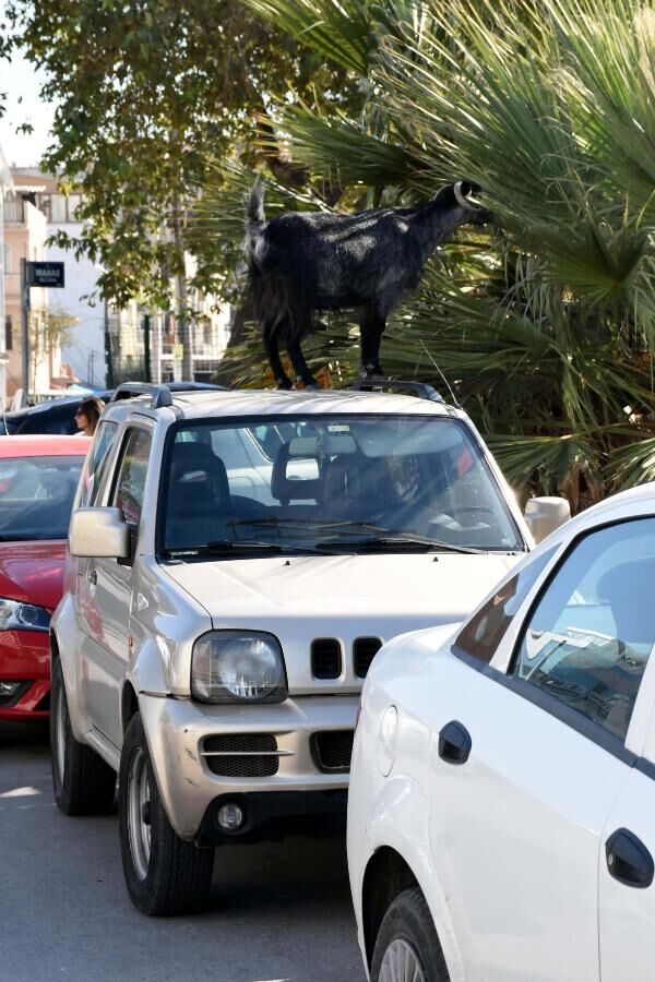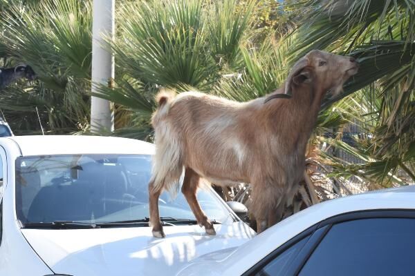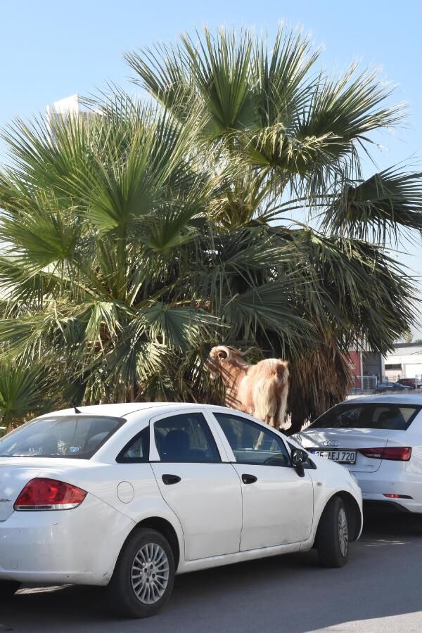İzmir’in Bayraklı ilçesinde, başıboş bırakılan keçiler, araçların üzerine çıkıp ağaç dallarını yedi. Keçiler bunu yaparken de üzerine çıktıkları araçlara zarar verdi.
