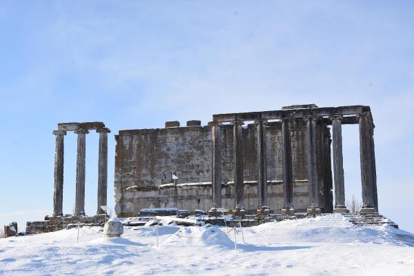 Yılda 60 binden fazla turisti ağırlayan Aizanoi Antik Kenti’nde kar kalınlığı 20 santimetreyi buldu. Antik kentte bulunan ve günümüze kadar gelen en sağlam Zeus Tapınağı'nda oluşan beyaz örtü, tarihi mekana görsel şölen sundurdu.