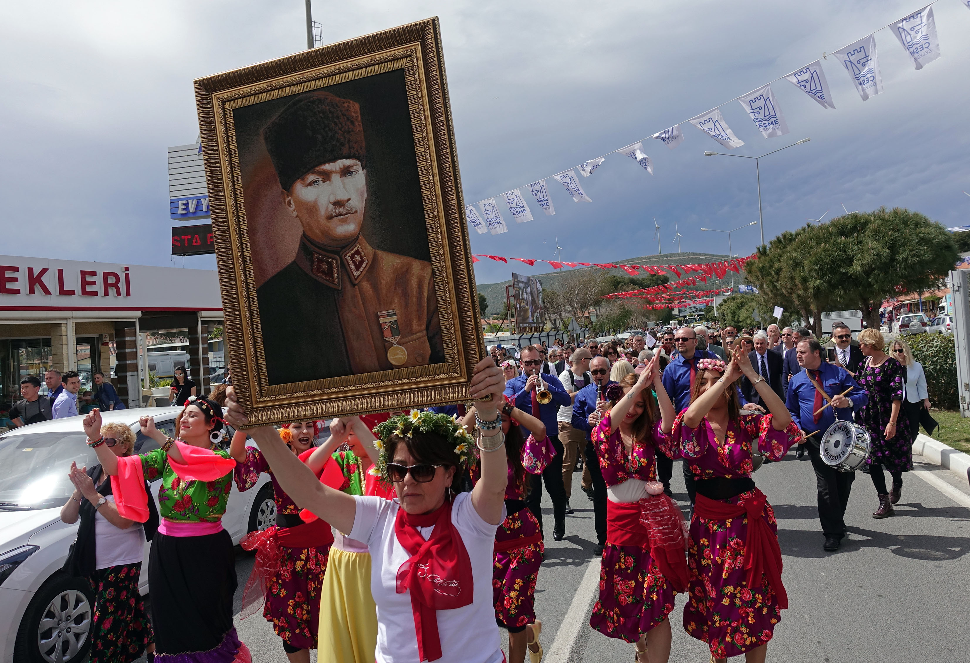 Alaçatı Mahallesi Atatürk Bulvarı'nda start alan kortejde, Atatürk'ün posterini taşıyan ve renkli kostümler giyen vatandaşlar, marşlar ve şarkılar eşliğinde yürüdü.