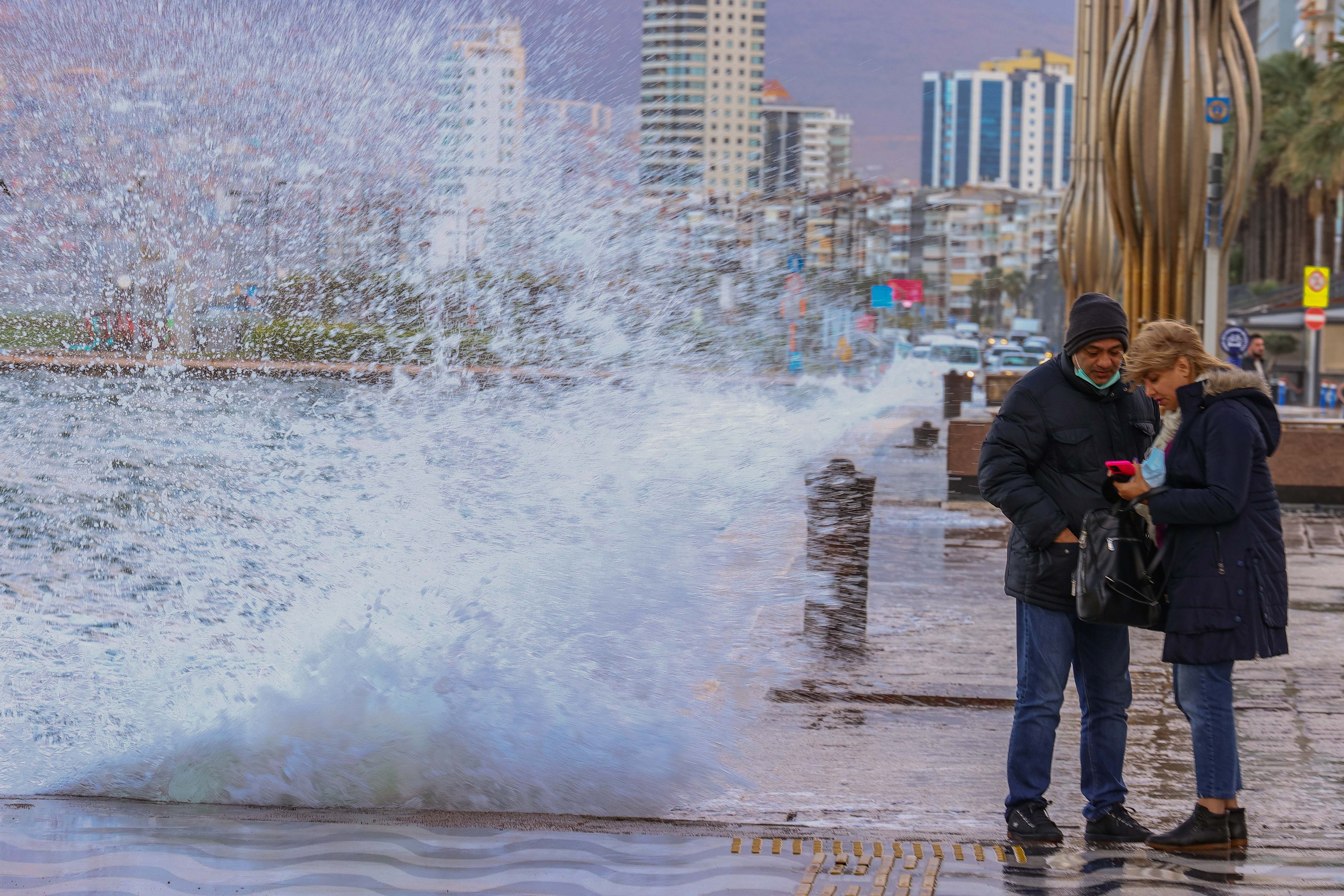 Cumhuriyet Meydanı ile Kordonboyu'nda dalga boylarının yükselmesinin ardından taşkınlar oluştu.