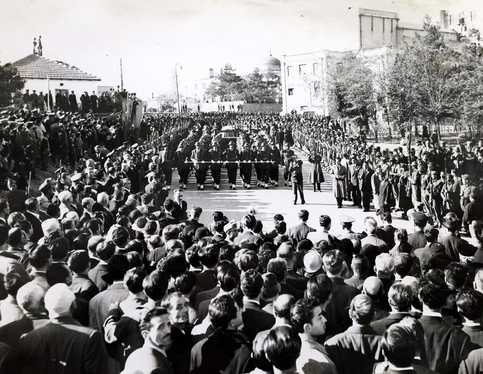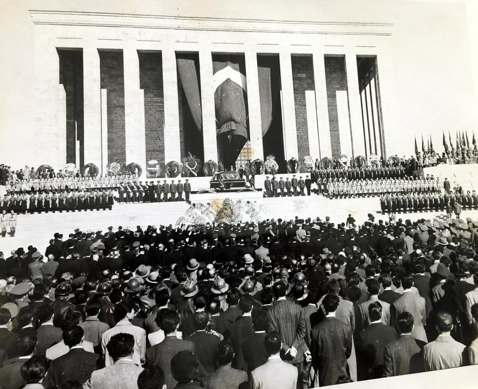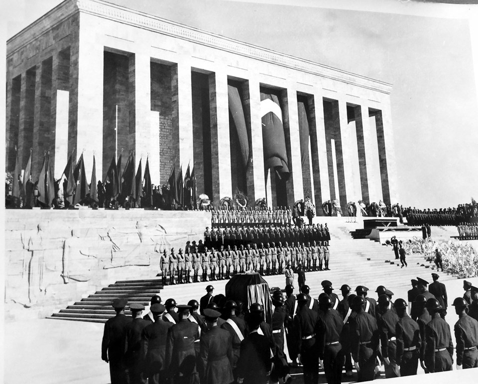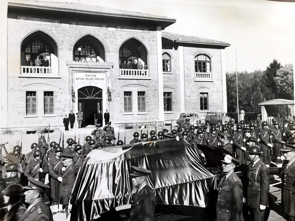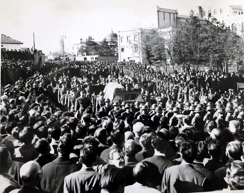 "10 Kasım 1953 günü Etnografya Müzesi önünde saat 09.05'de top atışları altında saygı duruşu sonrasında omuzlarda taşınan naaş top arabasına yerleştirildi. 136 genç asteğmenin çektiği top arabasına tören komutanı, karargahı Kara Harp Okulu Bandosu ve sancağı, Harp Okulu Alayı Flamaları, Hava Harp Okulu'ndan bir bölük, toplu halde bayrakları taşıyan gençler ile bir izci alayı iştirak etti."
