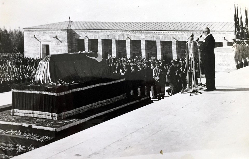 "Kortej 12.15'de Anıtkabir'e ulaştı ve Ata'nın naaşı askerlerin omuzlarında Aslanlı Yol'dan hareketle tabut 12.50'de Şeref Holüne çıkan merdivenlerin ortasındaki Hitabet Kürsüsü'nün arkasında hazırlanmış olan koyu vişne rengi katafalk üzerine kondu. Sanduka açılarak saat 13.30'da naaş, Mehmetçiklerin elleriyle ebedi istiratgahına indirildi."