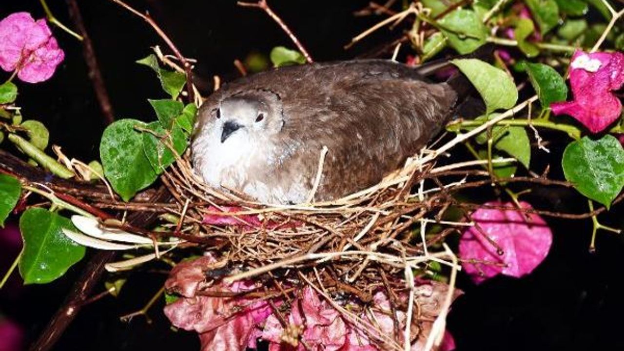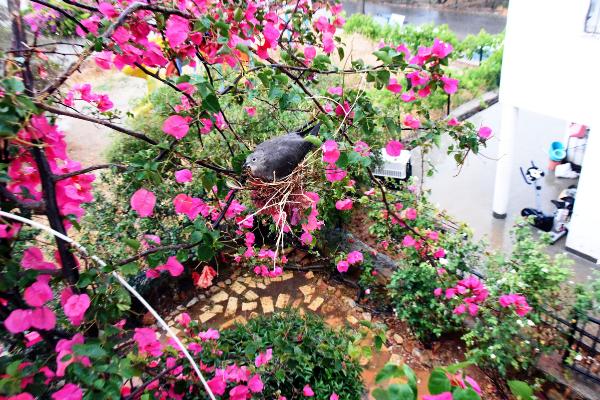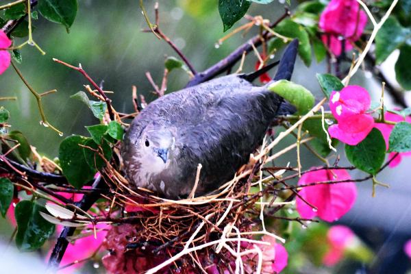 Yağmur ve hemen arkasından çıkan fırtına, 8 metre yüksekliğindeki begonvilin dallarındaki yuvası hızla sallanan kumru, yavrularını koruyabilmek için üzerlerinden kalkmadı.