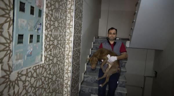 Olay yerine gelen veteriner ekipleri, apartmana girdi. Köpeğin uysal olduğunu fark eden ekipler, yanına çağırarak kucağına aldı. Köpek, ekipler tarafından barınağa götürüldü.