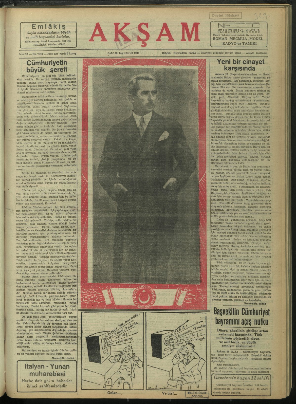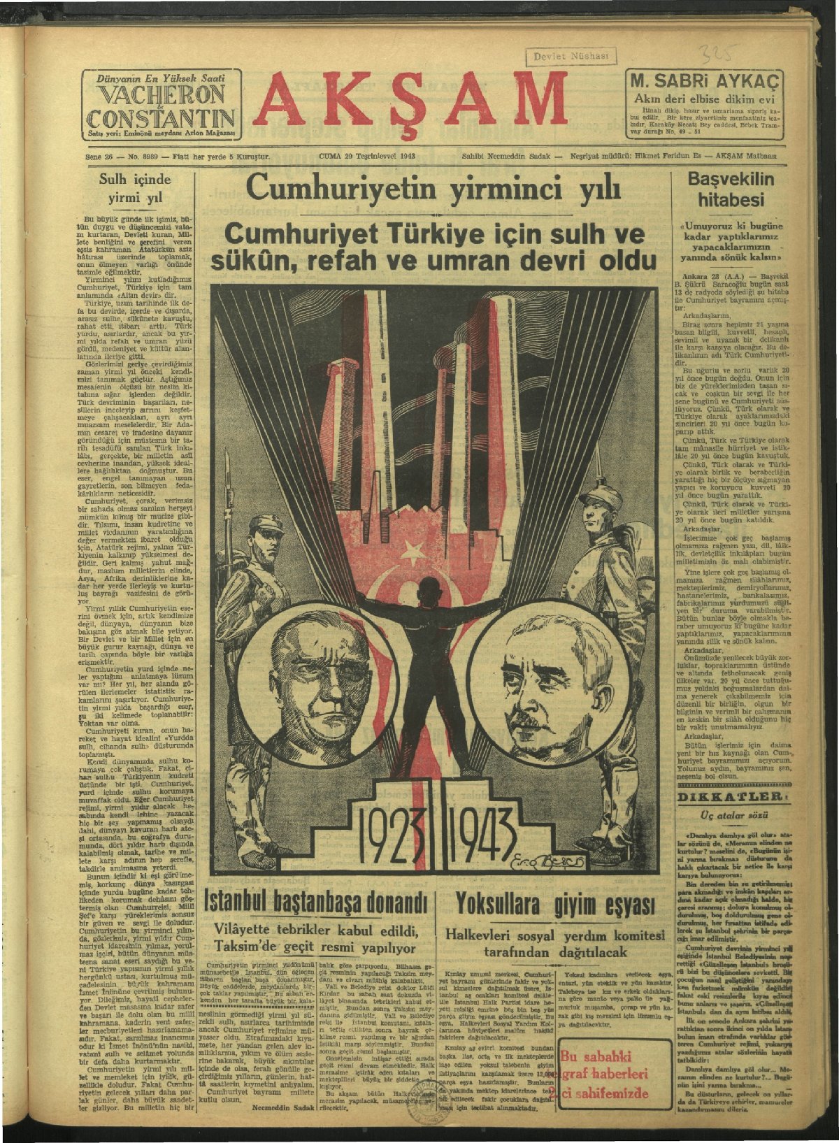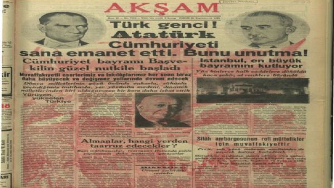 Cumhuriyet, Türkiye için sulh, sükun, refah ve umran devri oldu. (29 Ekim 1943, Akşam)
