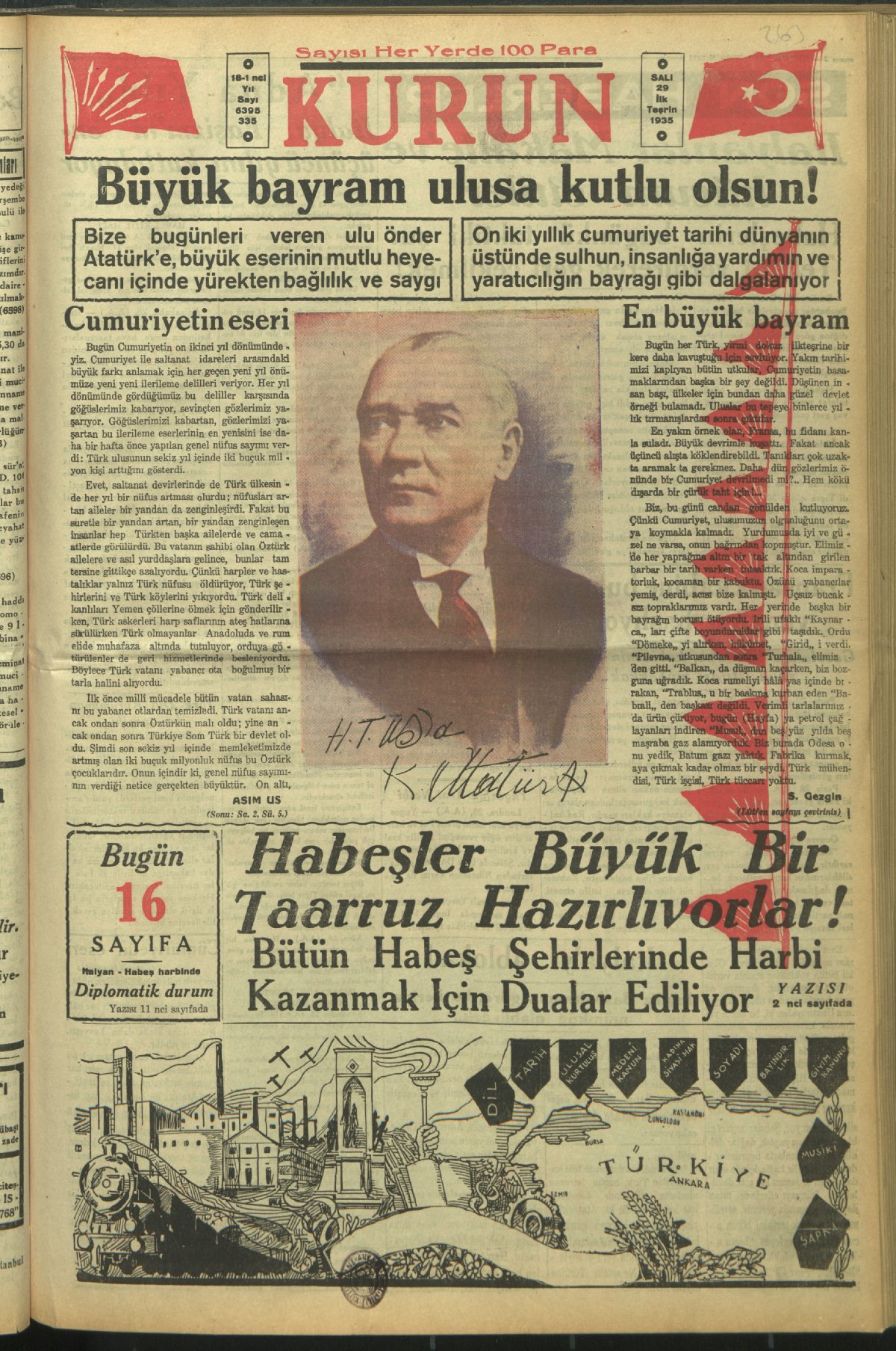 12 yıllık Cumhuriyet tarihi, dünyanın üstünde sulhun, insanlığa yardımın ve yaratıcılığın bayrağı gibi dalgalanıyor. (29 Ekim 1935, Kurun)
