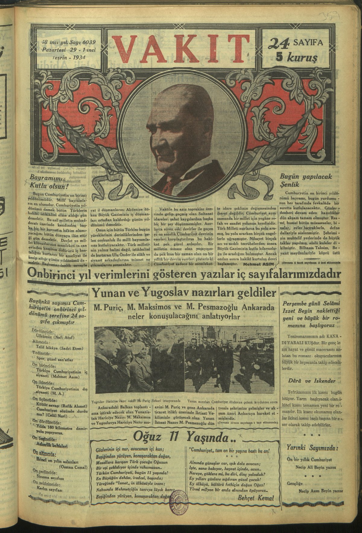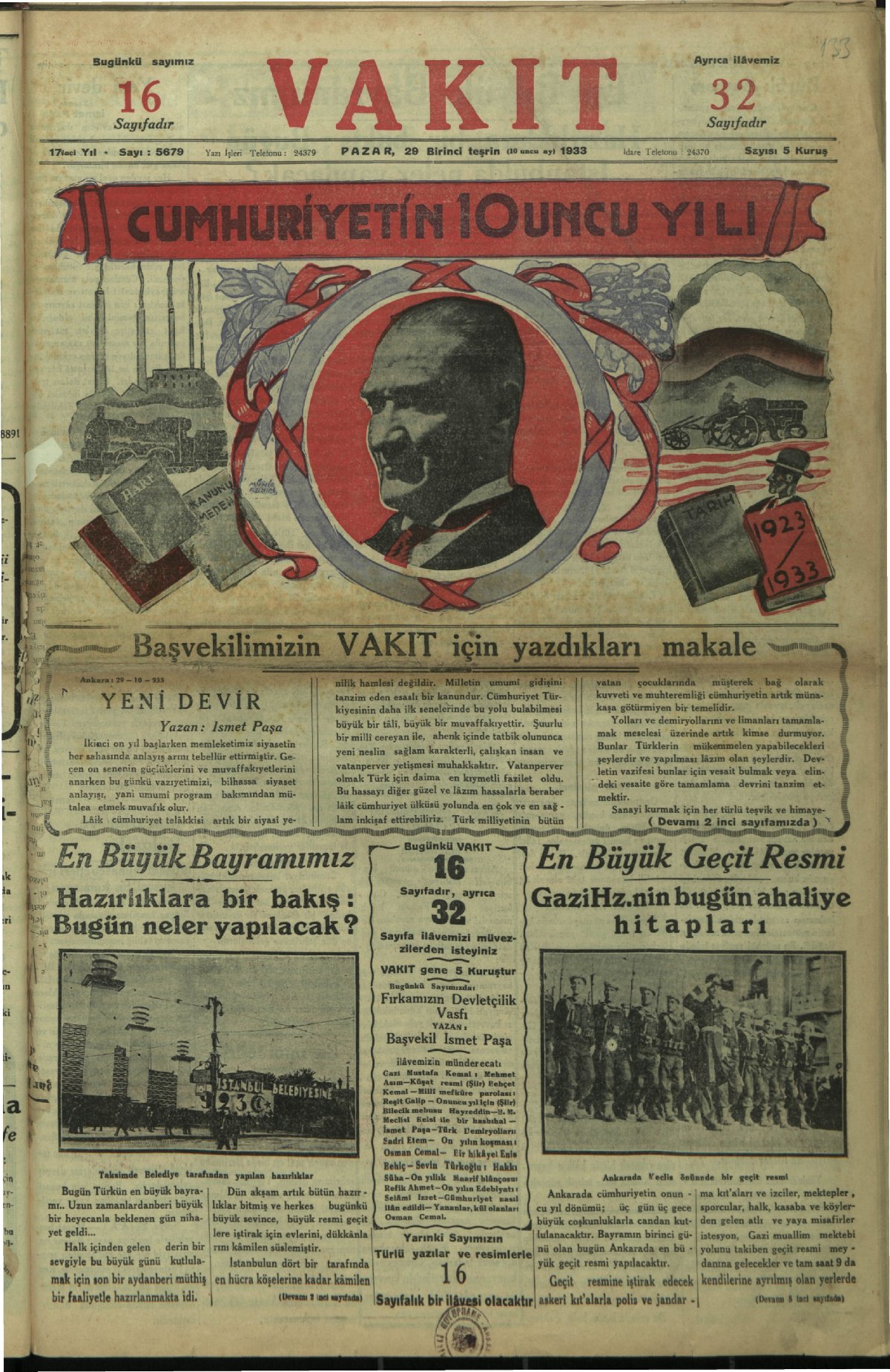 Bundan tam sekiz sene evvel bugün Türkiye Cumhuriyeti ilk gününü yaşıyordu. 1923 senesinin 29 Teşrinievvel (ekim) günü Türkiye tarihte ve şark (doğu) milletleri hayatında yepyeni bir doğum noktası oldu. Türkiye'yi Sevr girdabından Lozan vahasına götüren yeni ruh, genç hamle bugün tamamıyla hukuki ve siyasi bir cephe alarak, senelerden beri fiilen devam eden halk idaresine resmi ve kat'i şekli verdi. (29 Ekim 1931, Vakit)