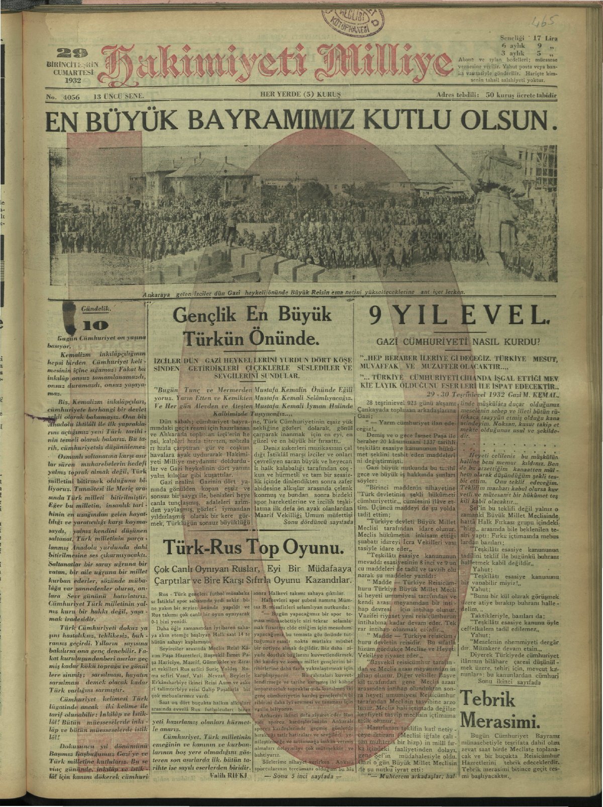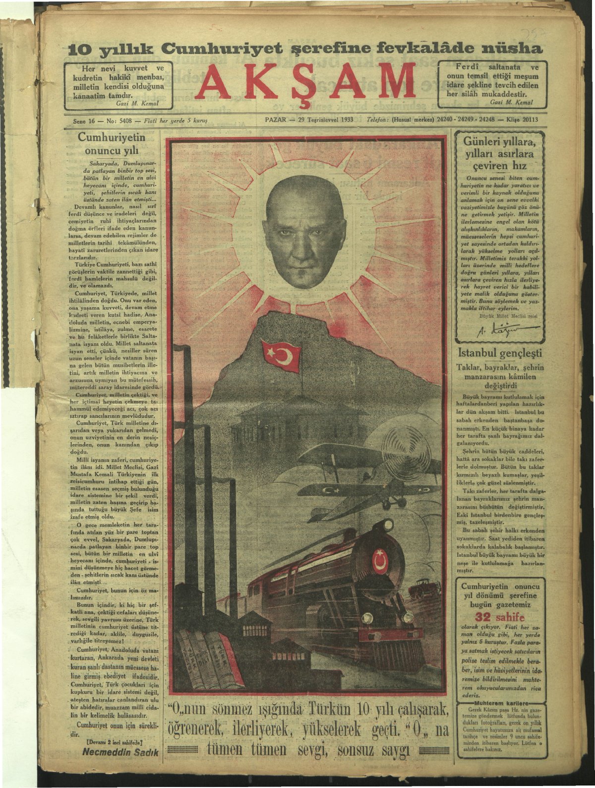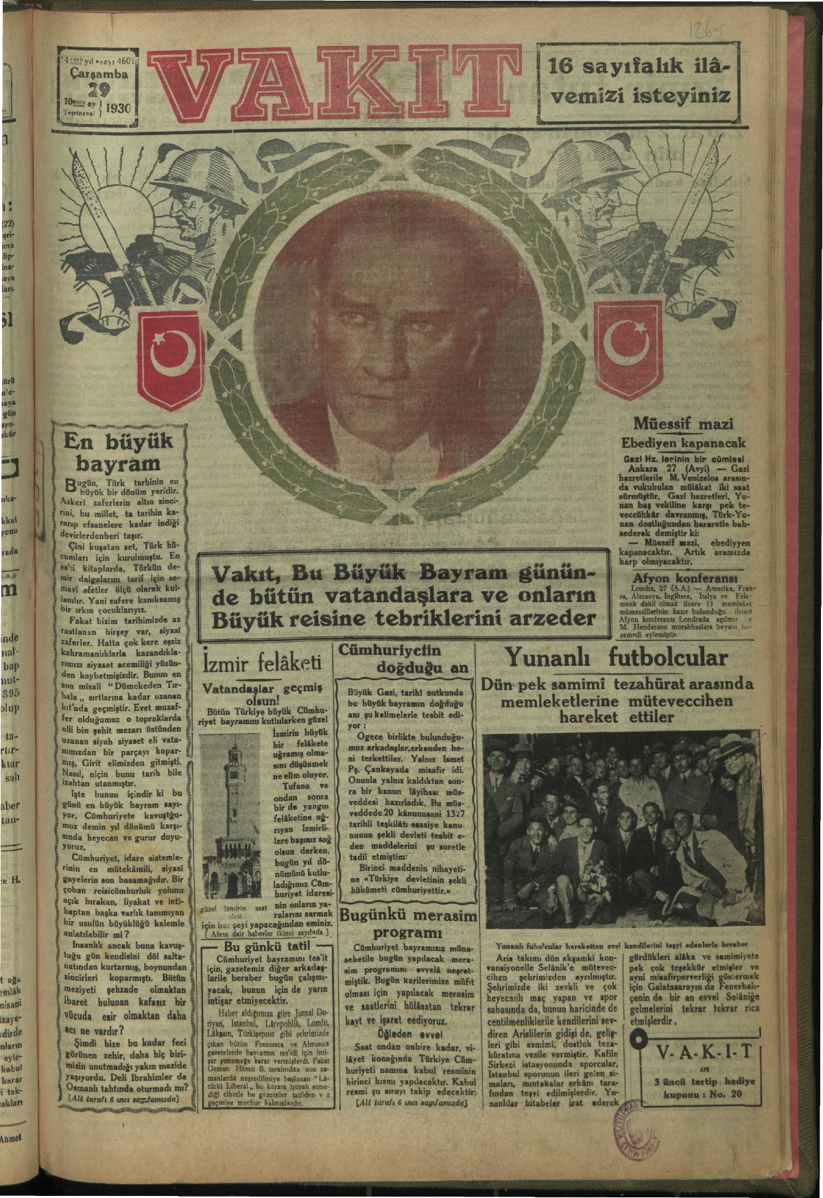 En büyük bayramımız, eşsiz inkılâbın ölçüsüz büyüklüğünü bütün milletçe kutladığımız gün. (29 Ekim 1936, Ulus)