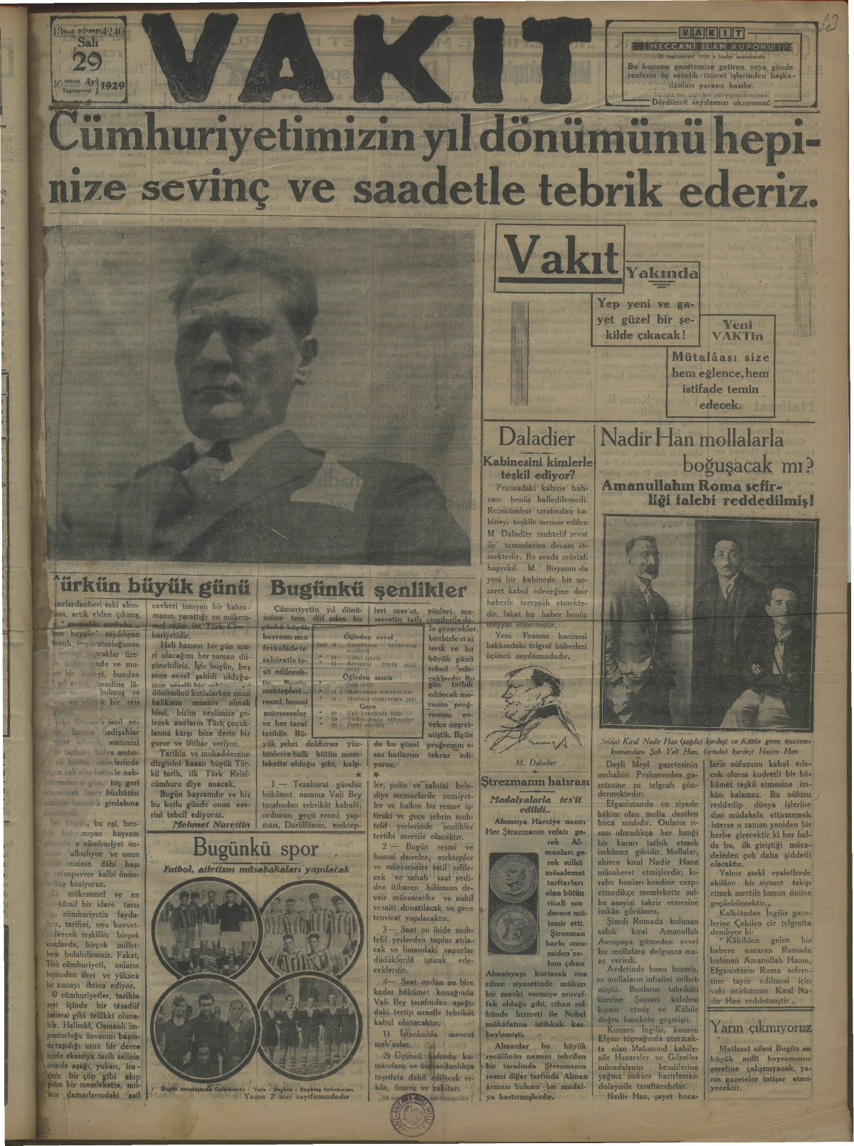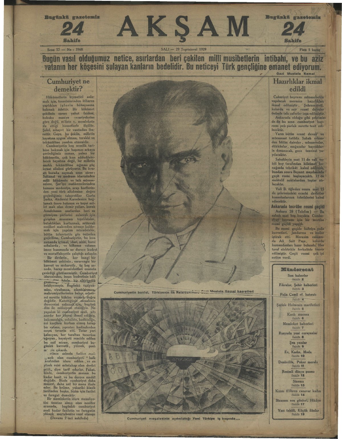 Matbuat (basın) ailesi bugün en büyük milli bayramımız şerefine çalışmayacak, yarın gazeteler intişar (yayımlanma) etmeyecektir. (29 Ekim 1929, Vakit)