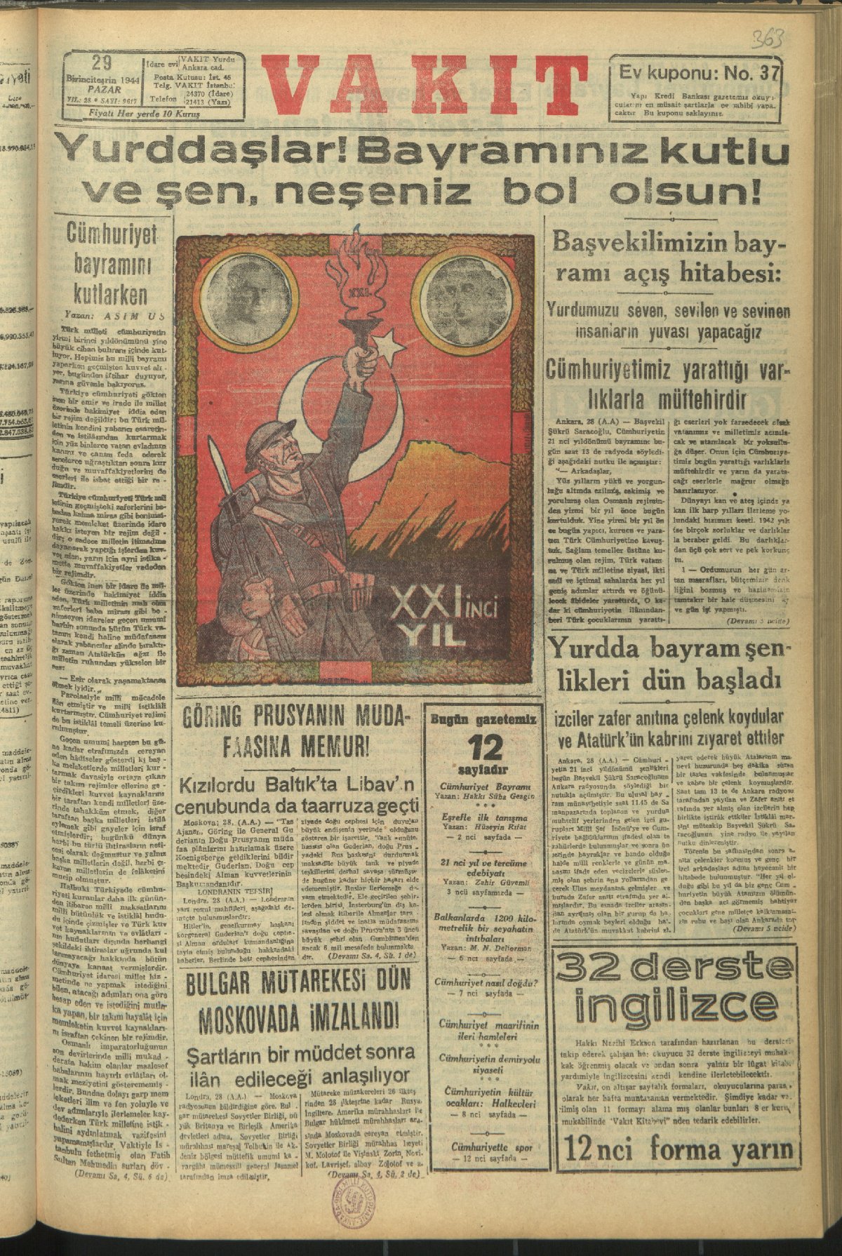 Dört seneden beri amansız bir harp bütün garp ve şark âlemini kan tufanına boğarken Türk milleti Cumhuriyet'in 20'inci yıldönümünü yine sulh güneşi altında kutluyor. (Asım Us, 29 Ekim 1943, Vakit)
