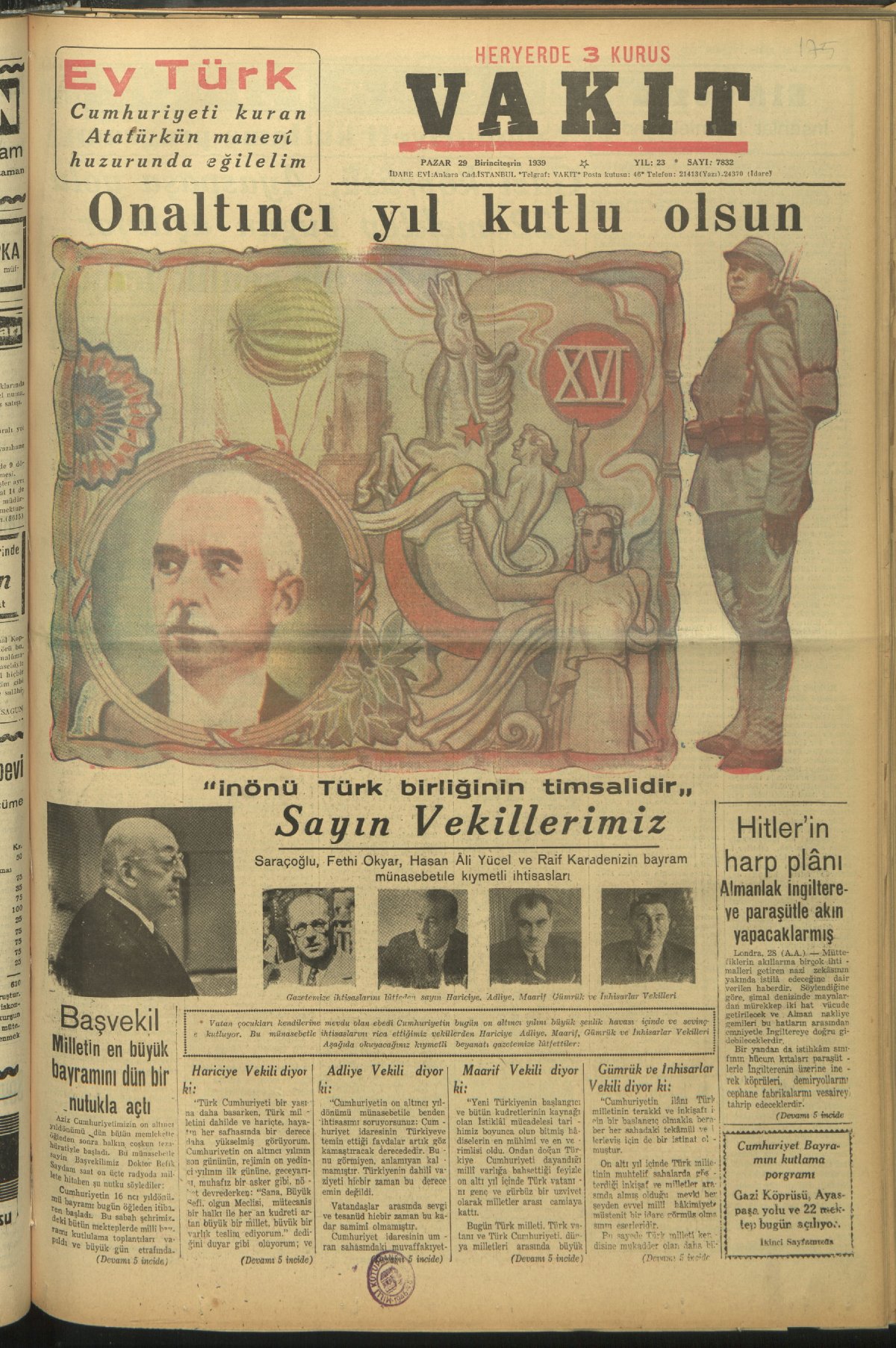 Cumhuriyet'in 16 senelik mazisi azametli ve muhteşemdir. Baaşardığımız eserle bir nesil değil, bir tarih övünebilir. Fakat bizim âdetimiz istikbale bakmaktır. (Falih Rıfkı Atay, 29 Ekim 1939, Ulus)