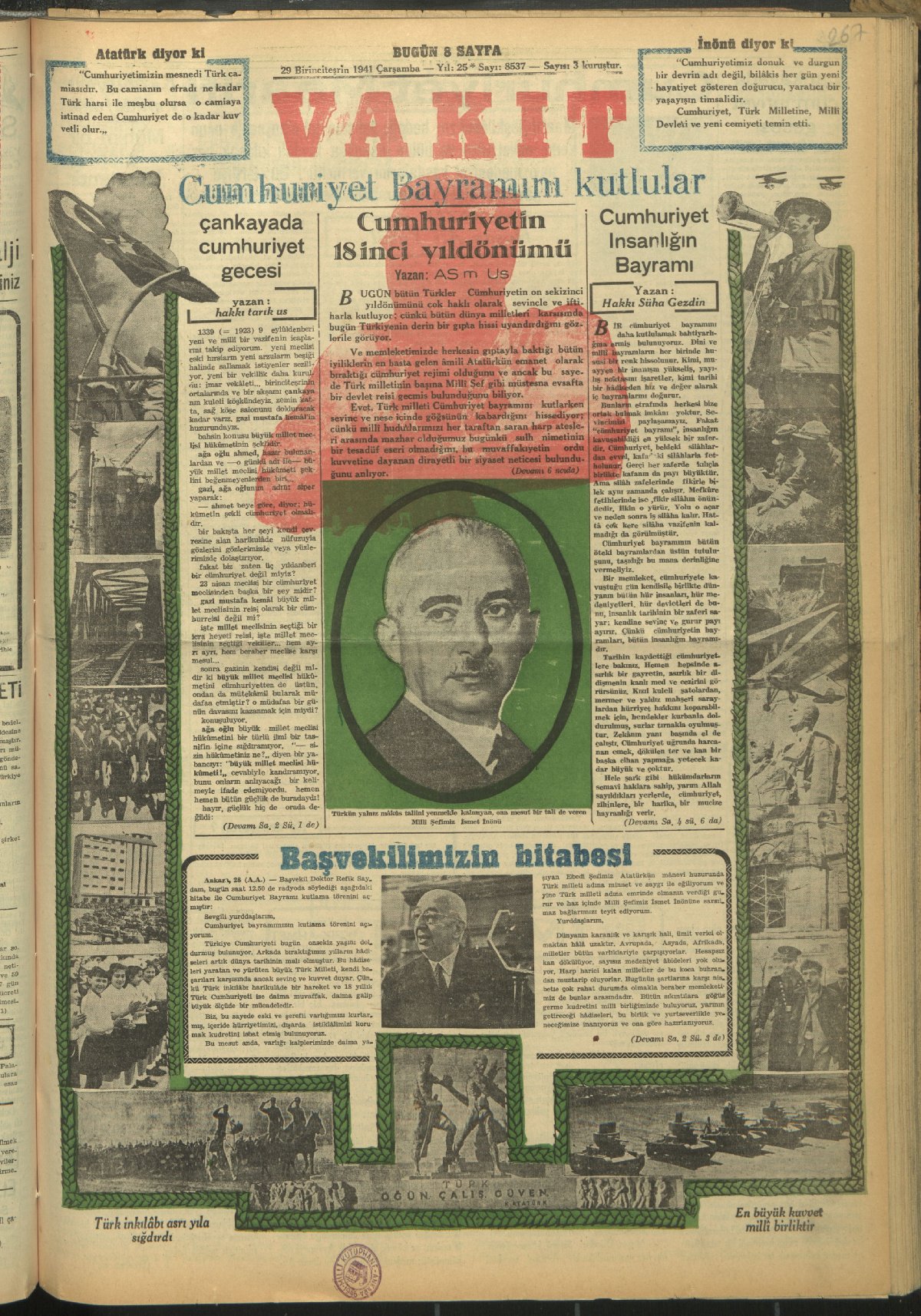 Türkiye, bugünkü bahtiyarlığını Cumhuriyet'e ve onun büyük reisine borçludur. (Akşam, 29 Ekim 1941)