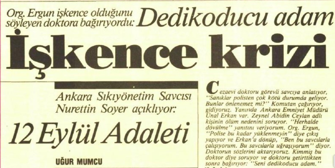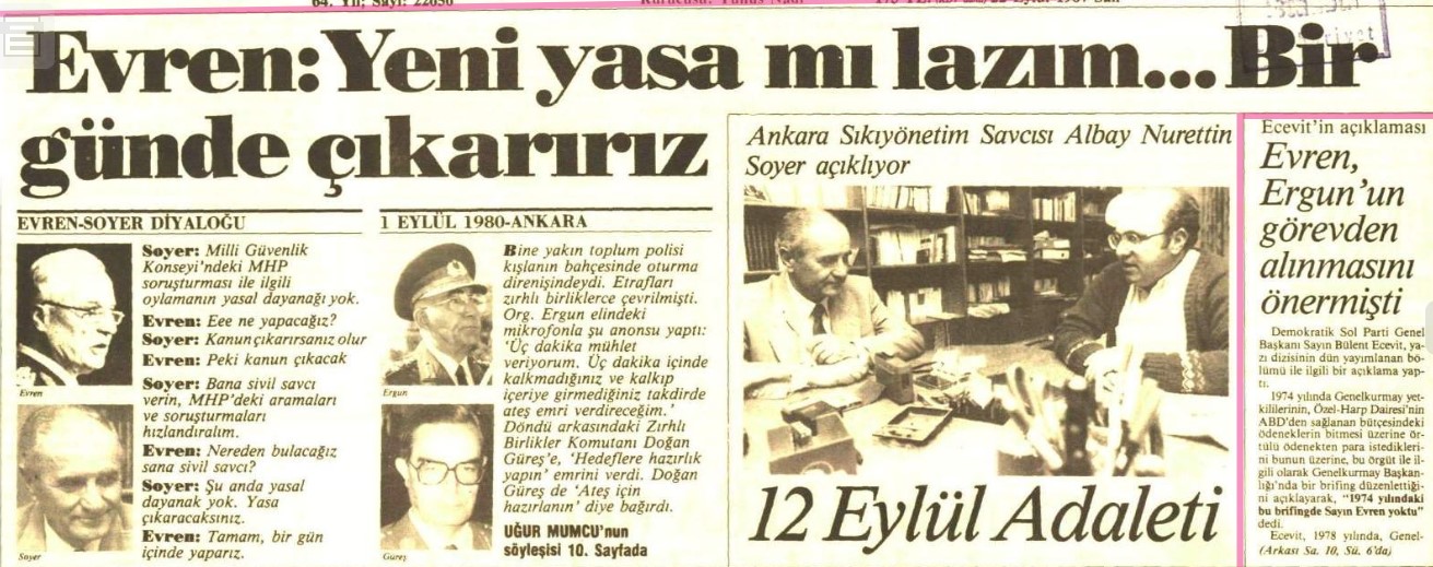 Bu soru, gazeteci Uğur Mumcu’nun "12 Eylül Adaleti" adıyla Kasım 1987'de yayımlanan kitabını bir kez daha gündeme getiriyor. İlk olarak Cumhuriyet gazetesinde yazı dizisi olarak yayımlanan kitapta, Nurettin Soyer Ankara Sıkıyönetim Askeri Savcısı olarak görev yaptığı dönemi anlatıyor. Soyer’in ‘kendi bakış açısını’ taşıyan anlatımlarında, güncel siyasi tartışmaya geçmişten yanıt özelliği taşıyan ayrıntılar da var.