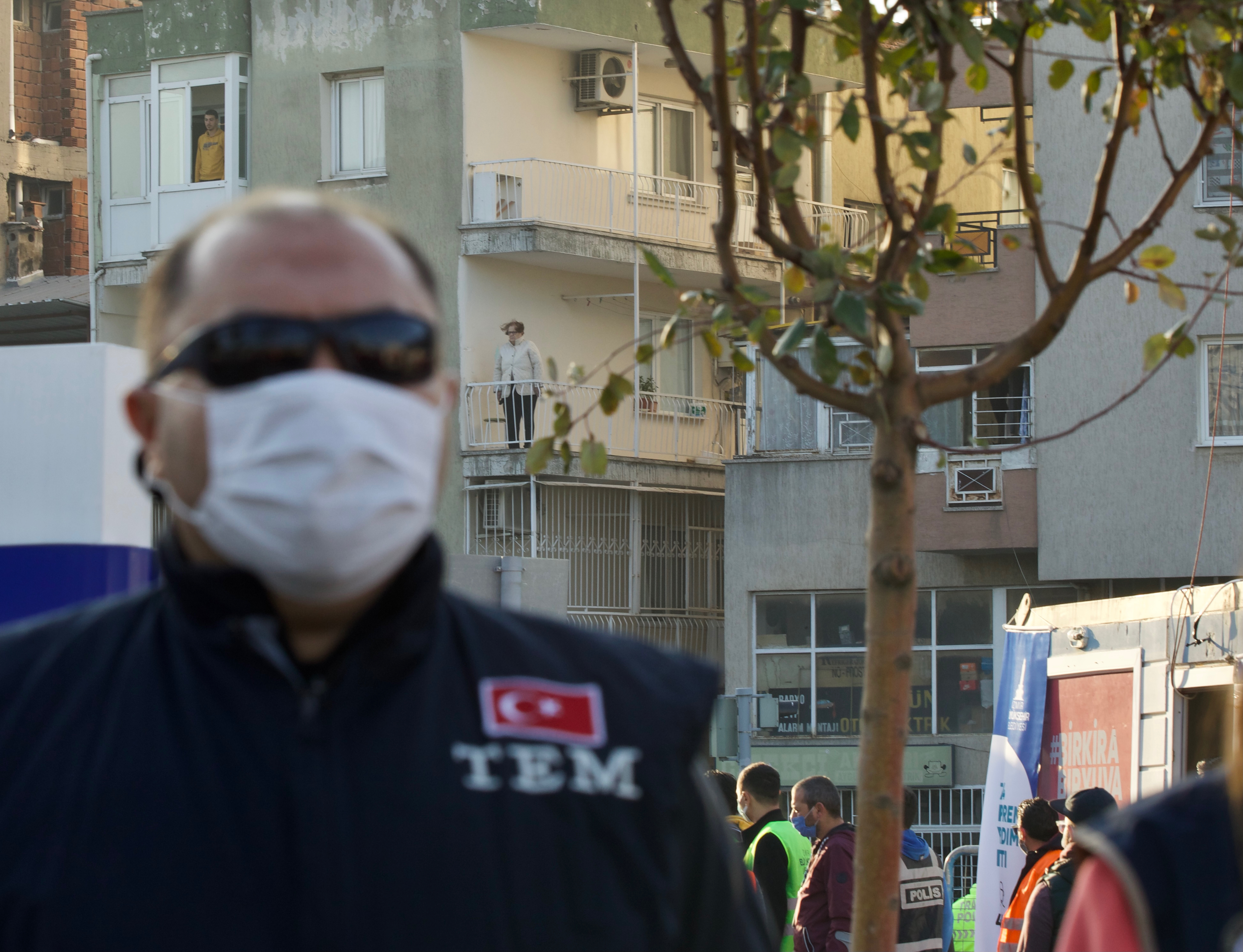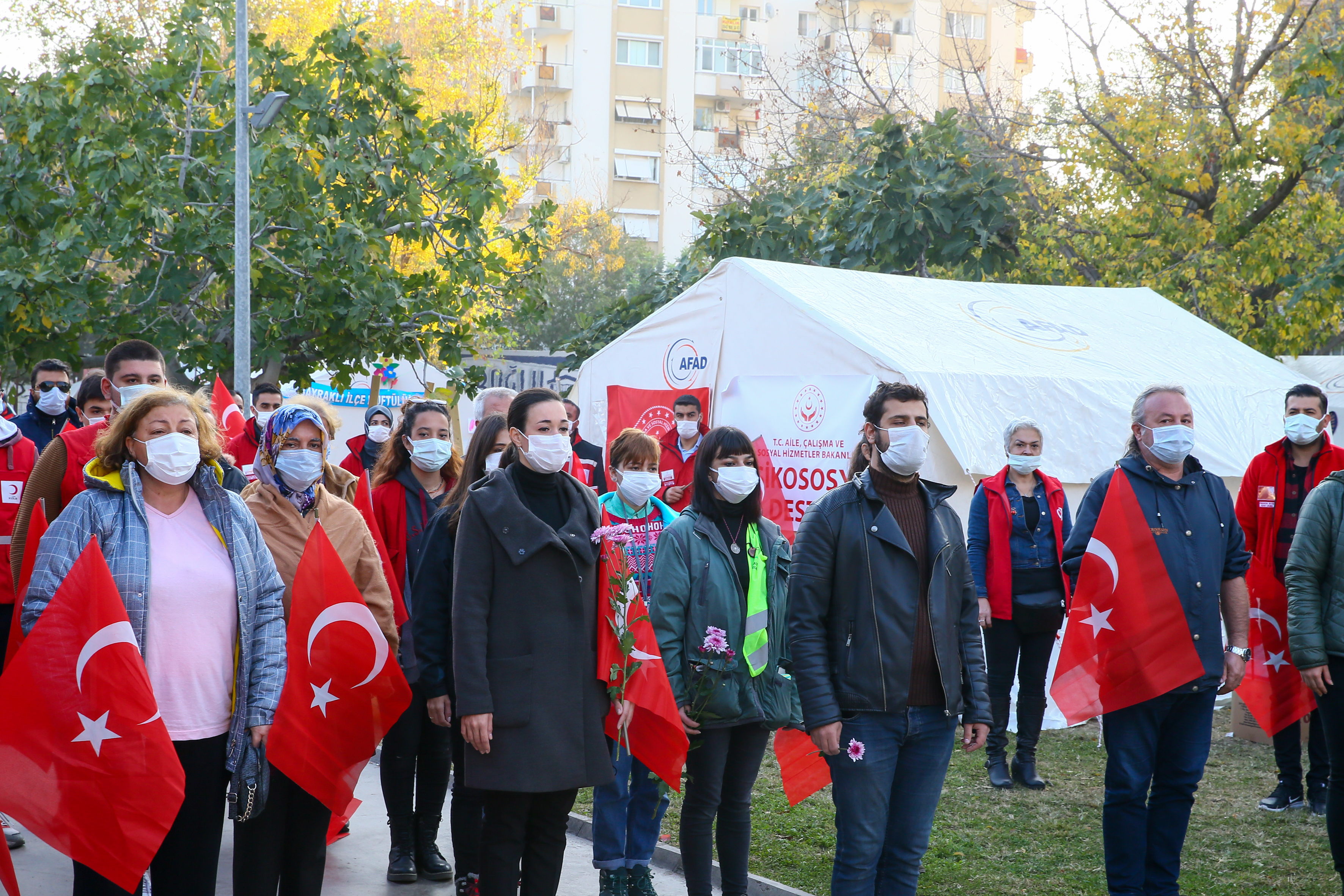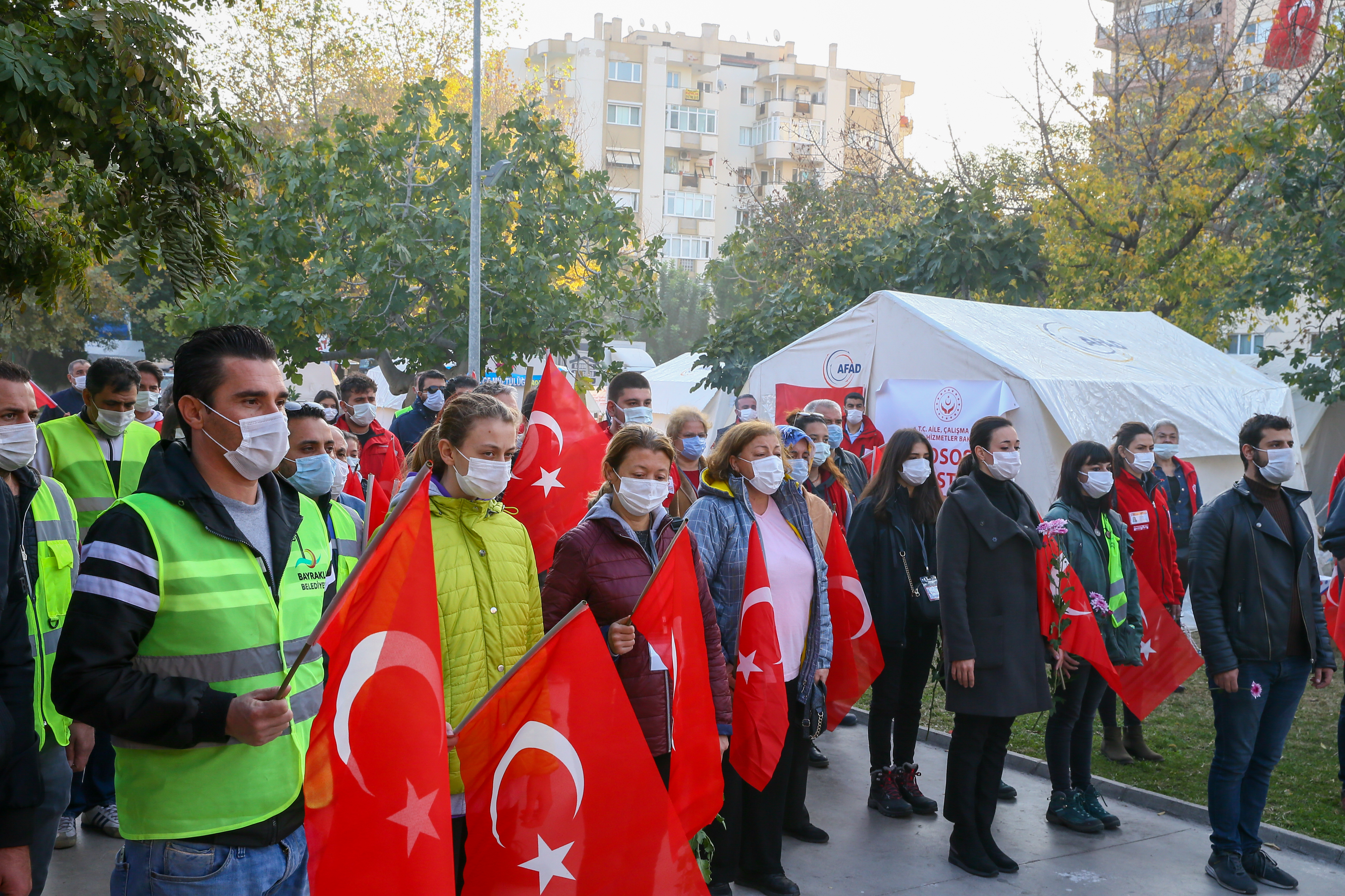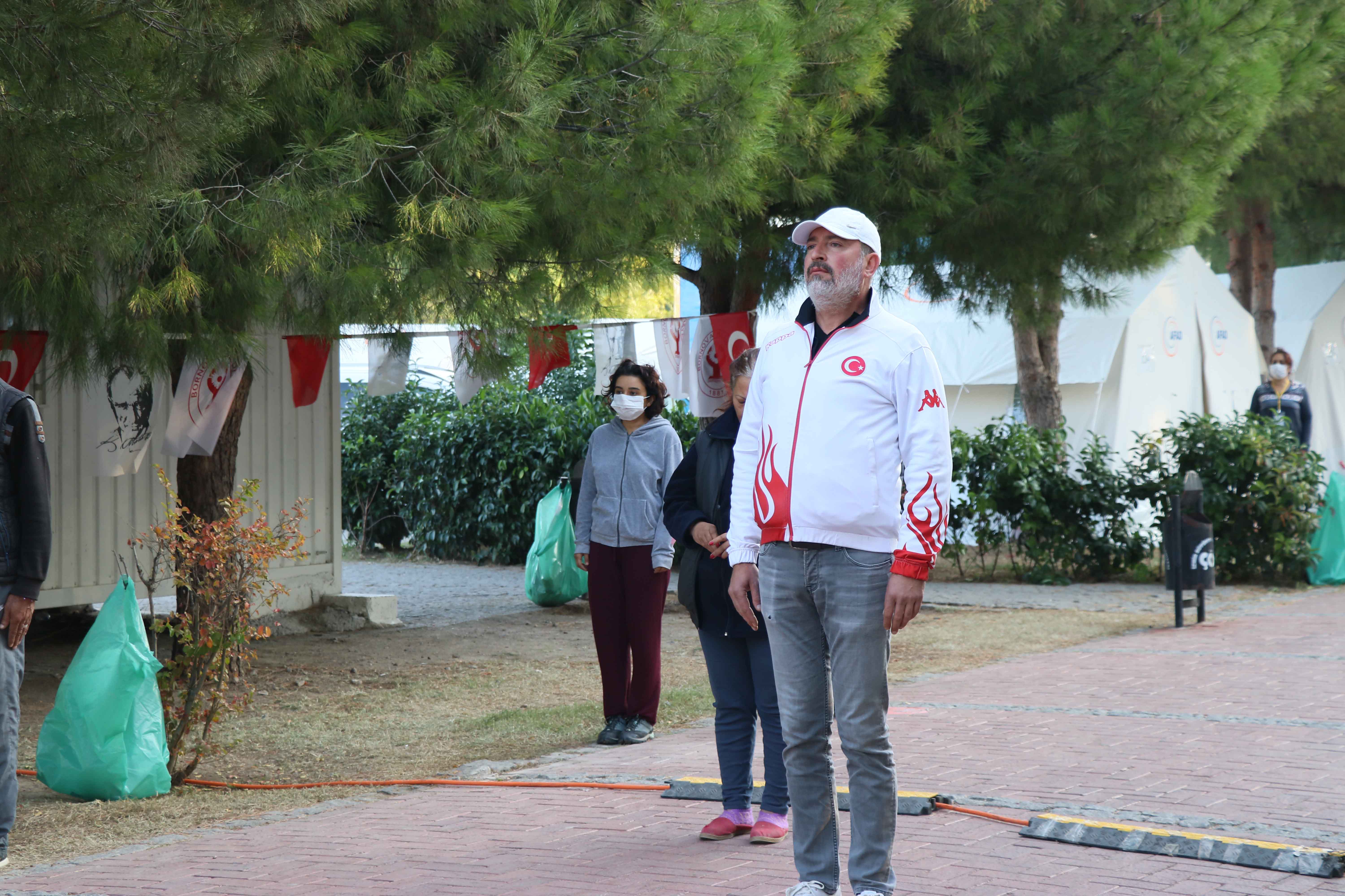 Türkiye Cumhuriyeti'nin kurucusu Büyük Önder Mustafa Kemal Atatürk'ün ebediyete intikalinin 82'nci yılı dolayısıyla saat 09.05'te İzmir'deki depremin ardından Aşık Veysel Rekreasyon Alanı'nda kurulan çadır kentte kalan depremzedeler 09.05'te saygı duruşunda bulundu.