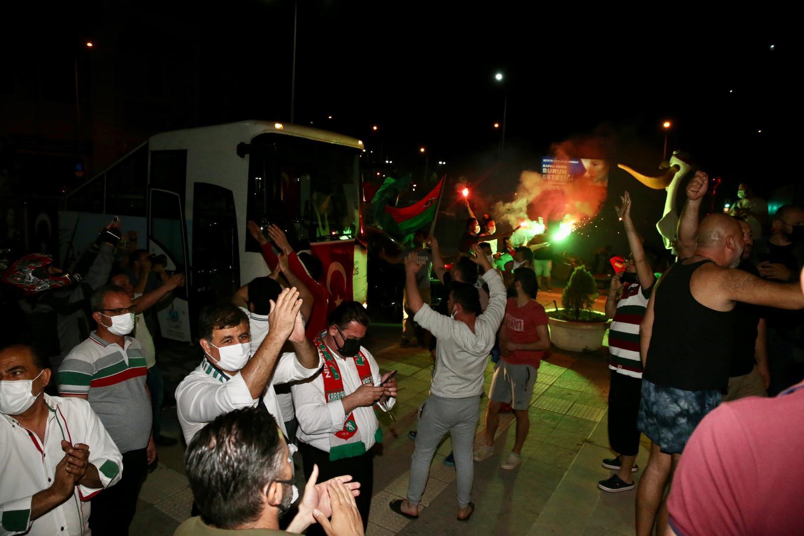 İlçe turu atan kafileye meşale şovu yaparak destek veren taraftarlar, antrenör Ufuk Sarıca’ya ve oyunculara sevgi gösterisinde bulundu.