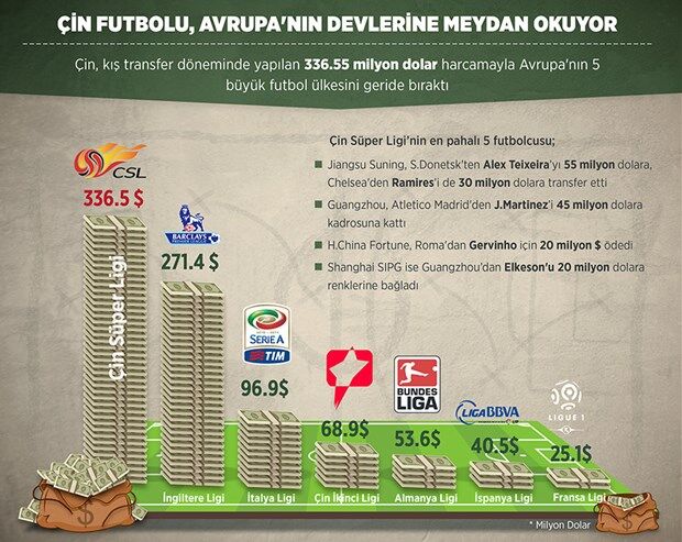 Yeni sezon için kesenin ağzını açan Çin, 336,55 milyon dolarlık harcamayla kış transfer döneminde Avrupa'nın 5 büyük futbol ülkesini