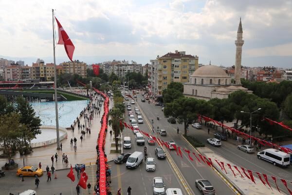 Aydın'da, Türkiye Cumhuriyeti'nin 94'üncü kuruluş yıldönümü kutlamaları, 500 metrelik Türk bayrağıyla yapılan kortej yürüyüşüyle başladı. Ardından Atatürk büstüne çelenk sunuldu.