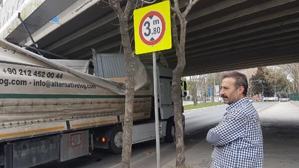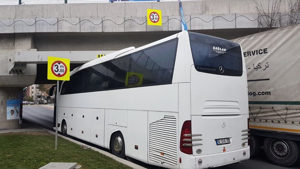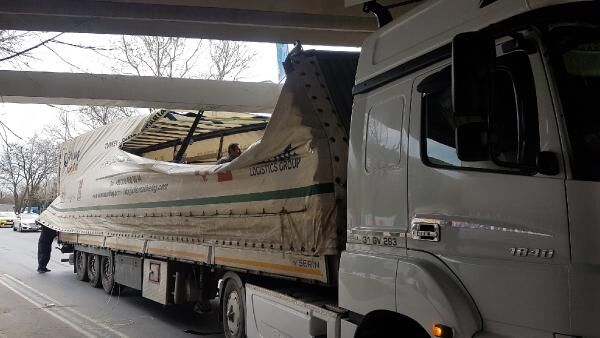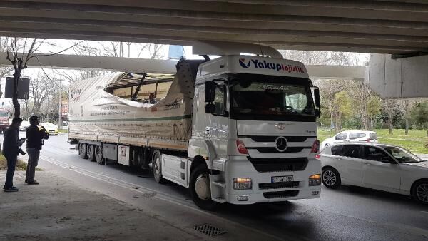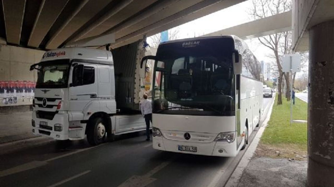 İstanbul'un Bakırköy ilçesine bağlı Ataköy'de TIR ve otobüs üst geçide sıkıştı.
