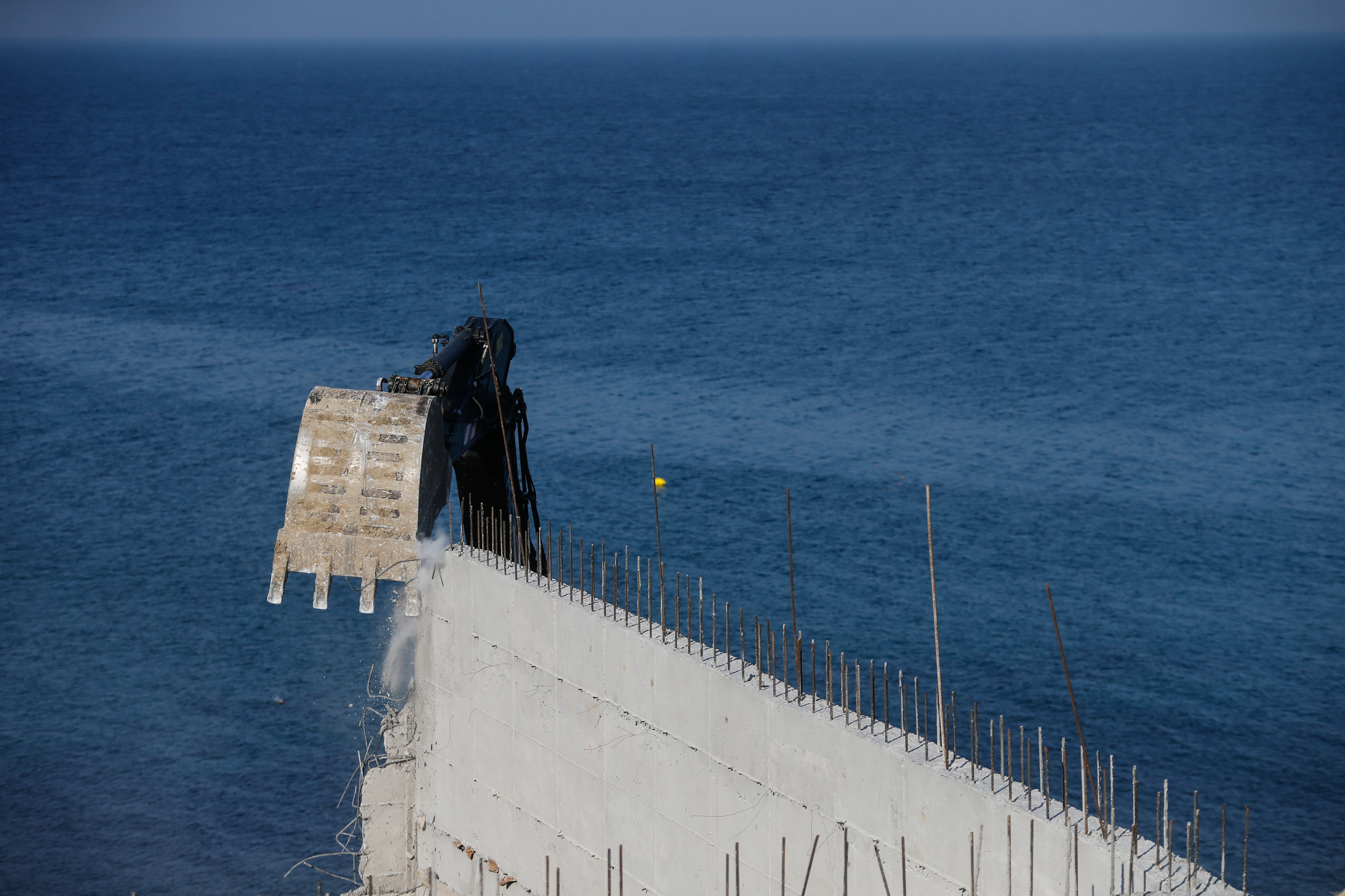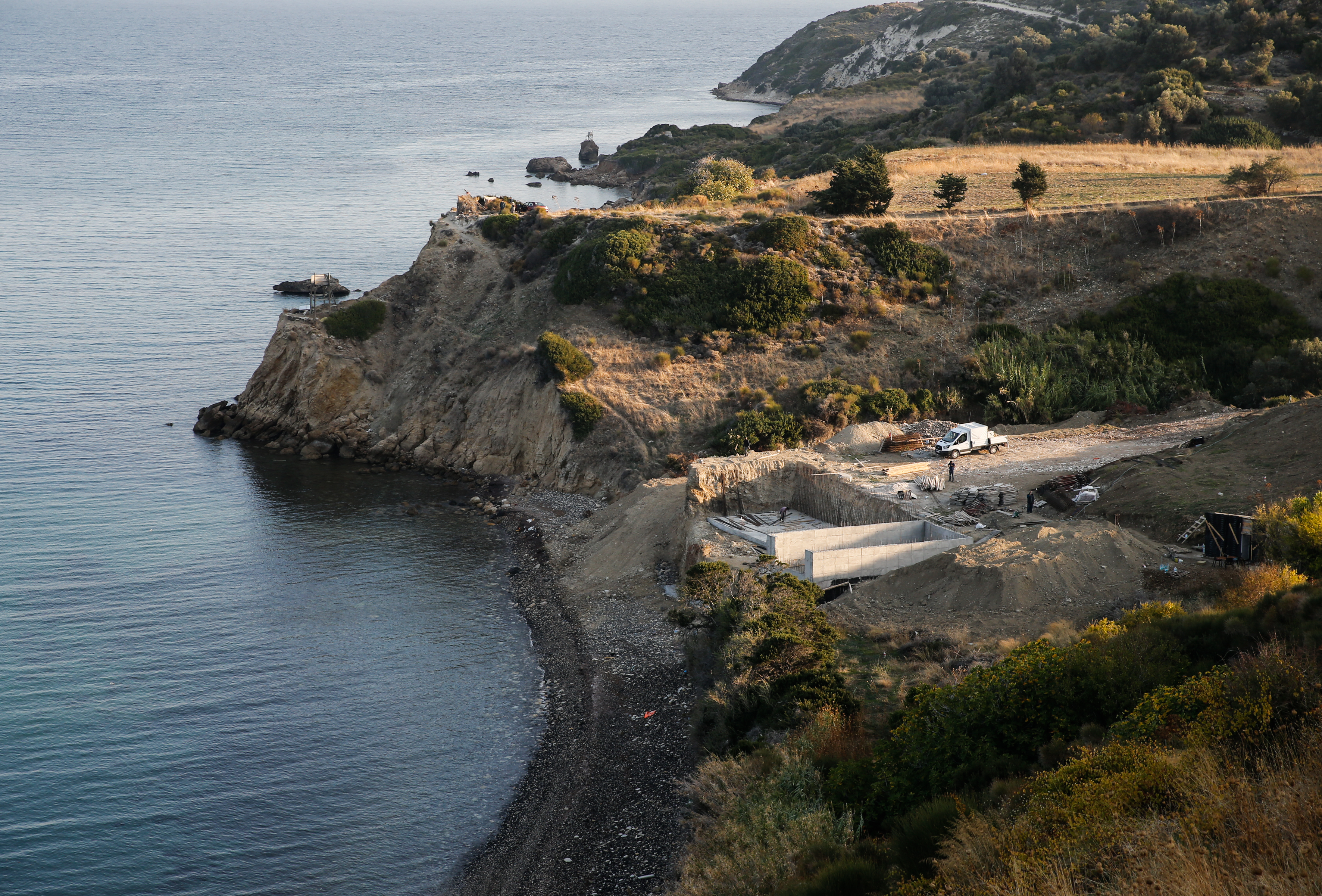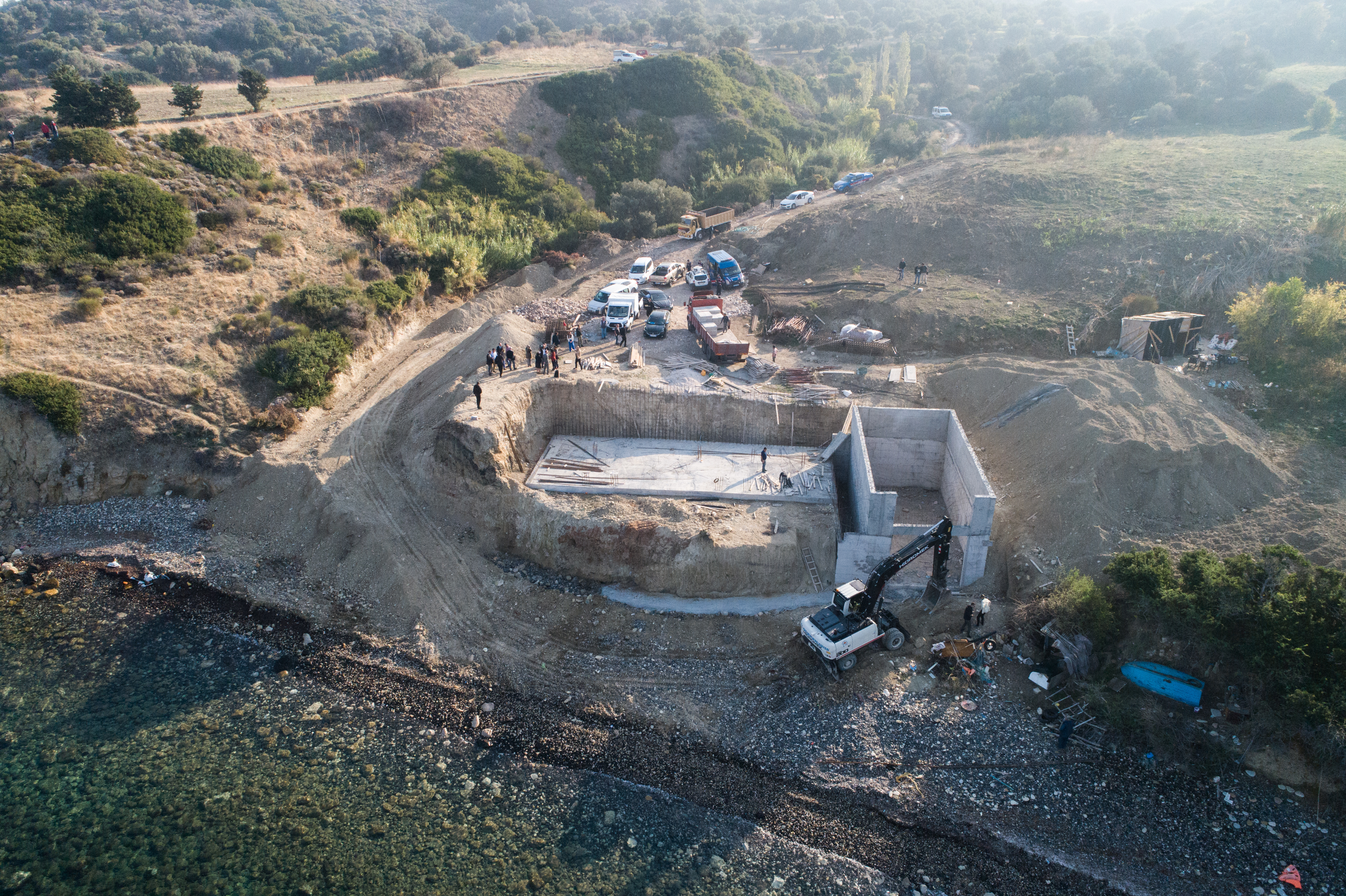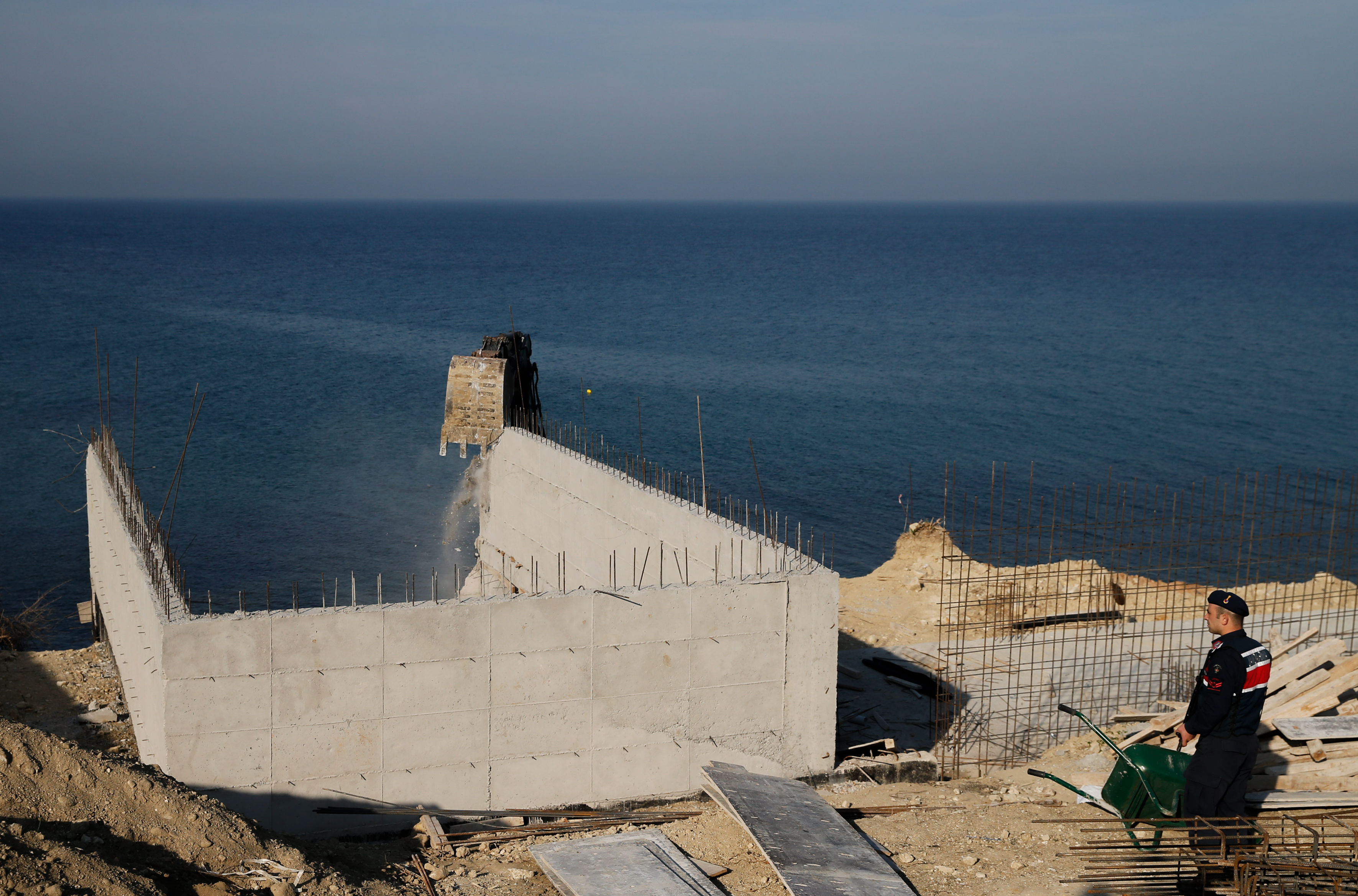 Hasseki Mahallesi'nin kıyı kesiminde bulunan Samsa Burnu'nda inşasına kısa bir süre önce başlanan yapının yıkımı öncesi, burada kullanılan malzemeler inşaatta çalışanlar tarafından toplanarak, kamyona yüklendi.