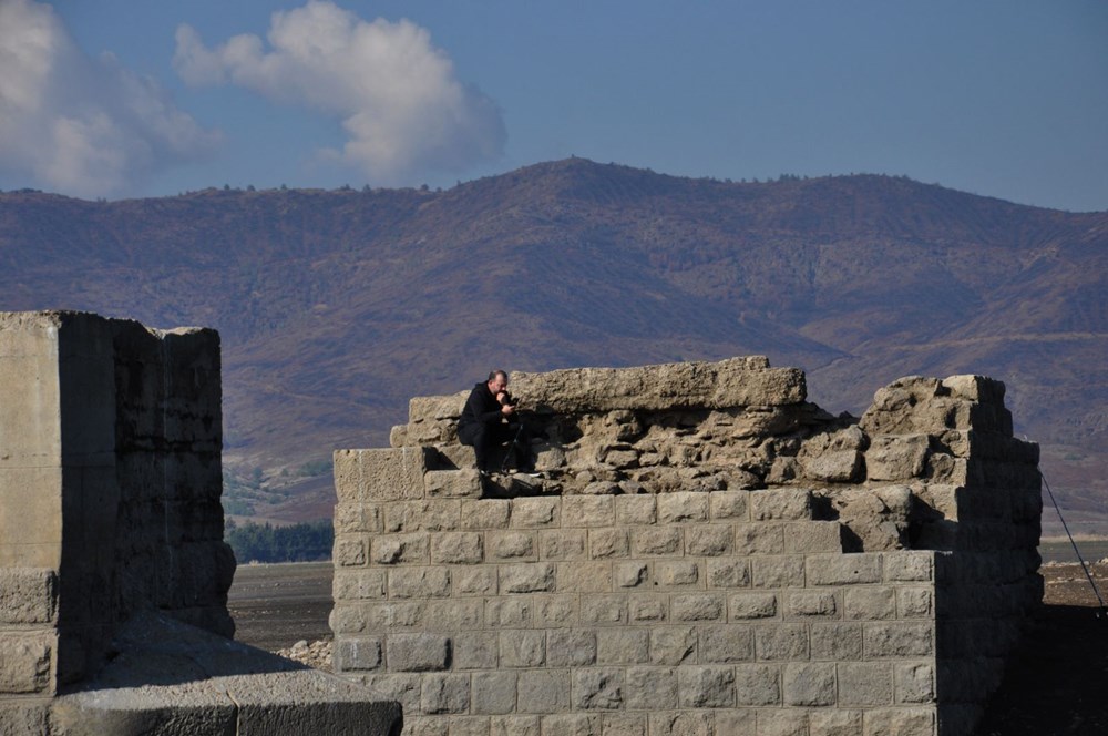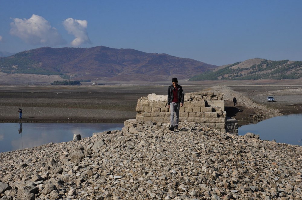 Bazalt taşlarla yapılmış demiryolu köprüsünün 7 metre yüksekliğindeki ayaklarının ortaya çıkmasının ardından köprüyü görmeye gidenler, balık tutup bol bol fotoğraf çekti.(DHA)