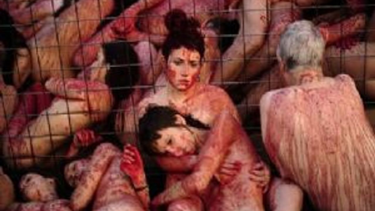 Grup, meydana getirdikleri kafesin içinde çıplak ve üzerleri kırmızı boya kaplı olarak protesto gerçekleştirdi.