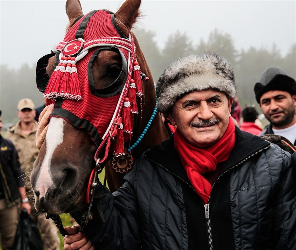 Güzergahında karşılaştığı atlı cirit ekibiyle bir süre sohbet eden Yıldırım, başına kalpak taktı ve onlarla birlikte fotoğraf çektirdi.