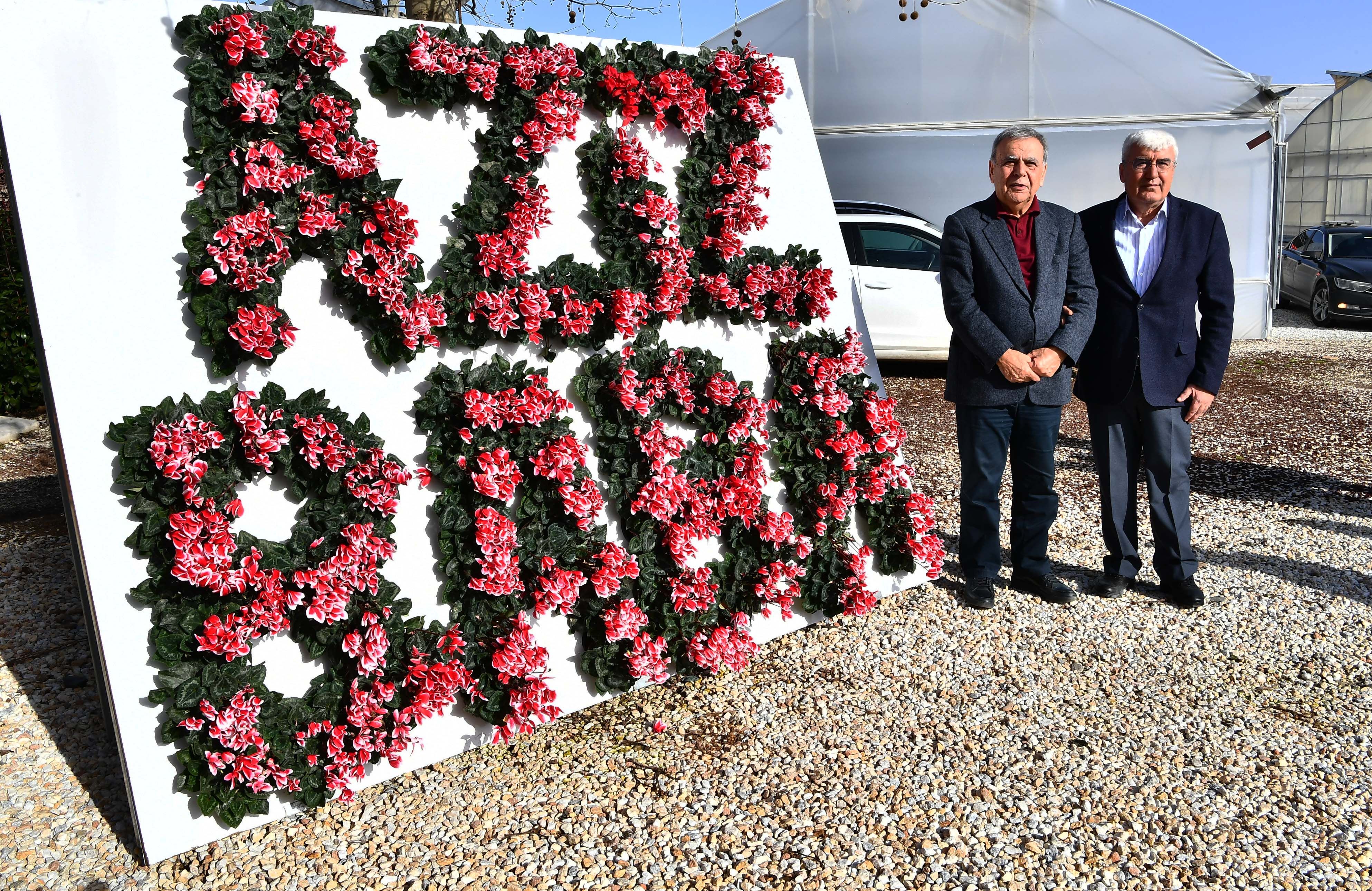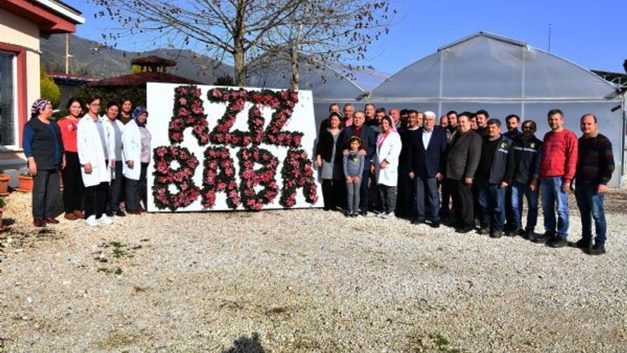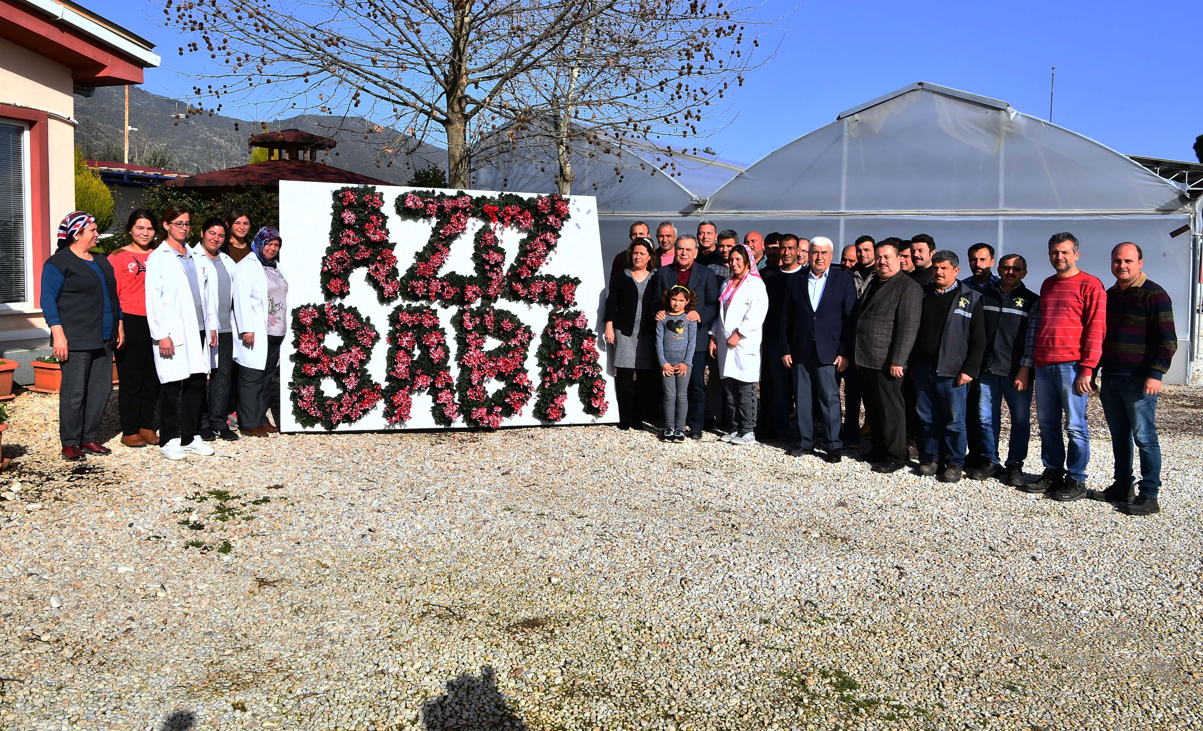 Bayındır Çiçek Üreticileri Kooperatifi (BAYÇİKOOP) çalışanları, bir panonun üzerine çiçeklerle "Aziz Baba" yazarak, önünde Başkan'la birlikte hatıra fotoğrafı çektirdi.