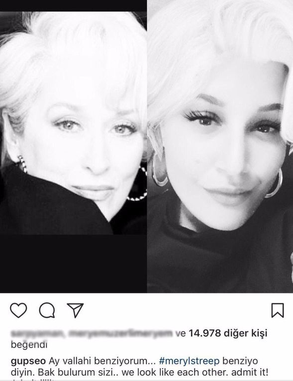 Sıra Gupse Özay'da. Sosyal medyada paylaştığı karşılaştırmalı fotoğrafta farklı bi tarza bürünen oyuncui kendisini dünyaca ünlü oyuncu Meryl Streep'e benzetti.