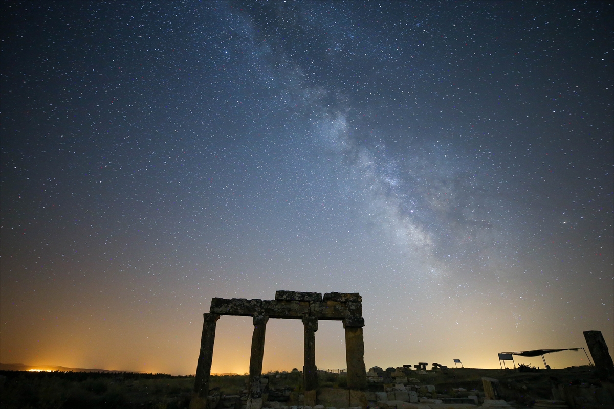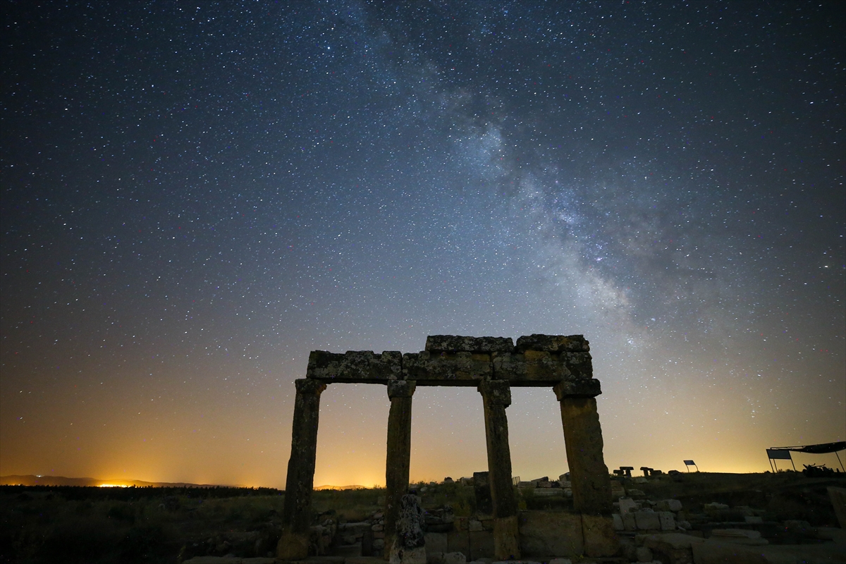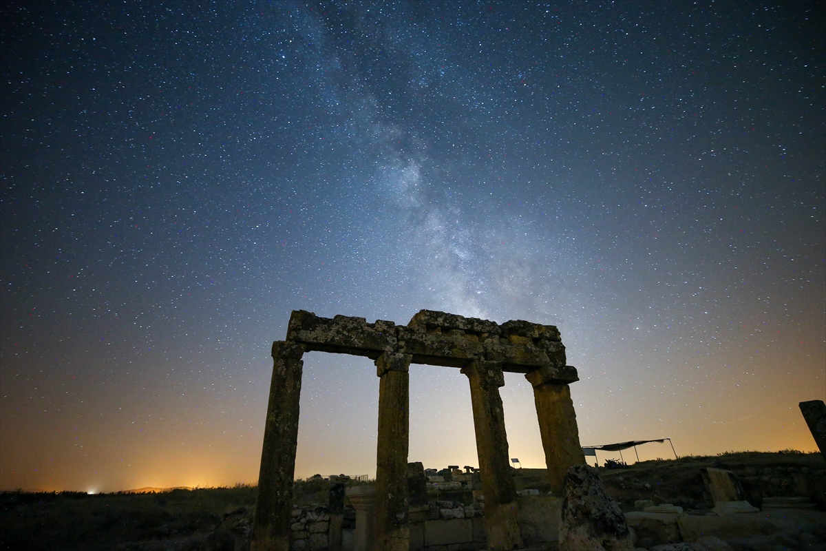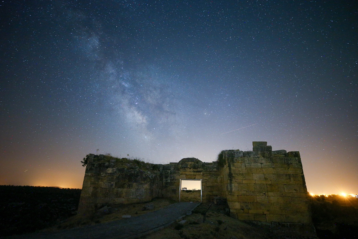 Tek girişinin olmasından dolayı doğal bir kale görümüne sahip Blaundos Antik Kenti'ndeki tarihi yapılar yıldızlarla birlikte güzel görüntü oluşturdu.