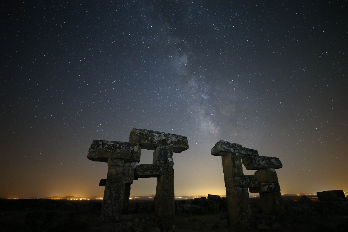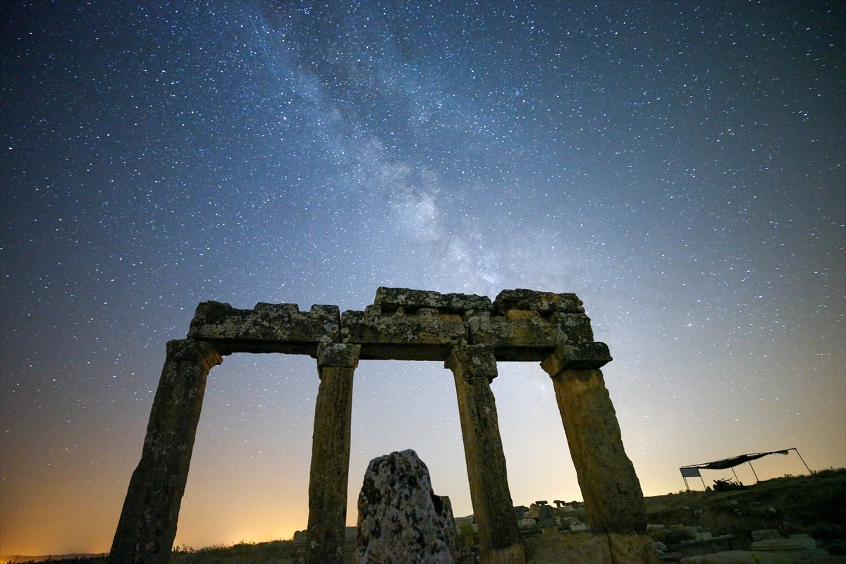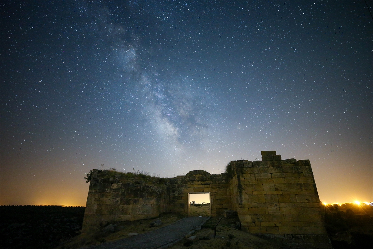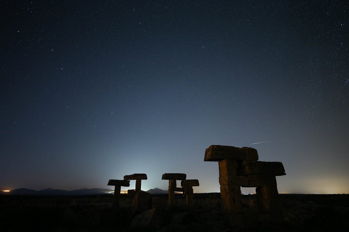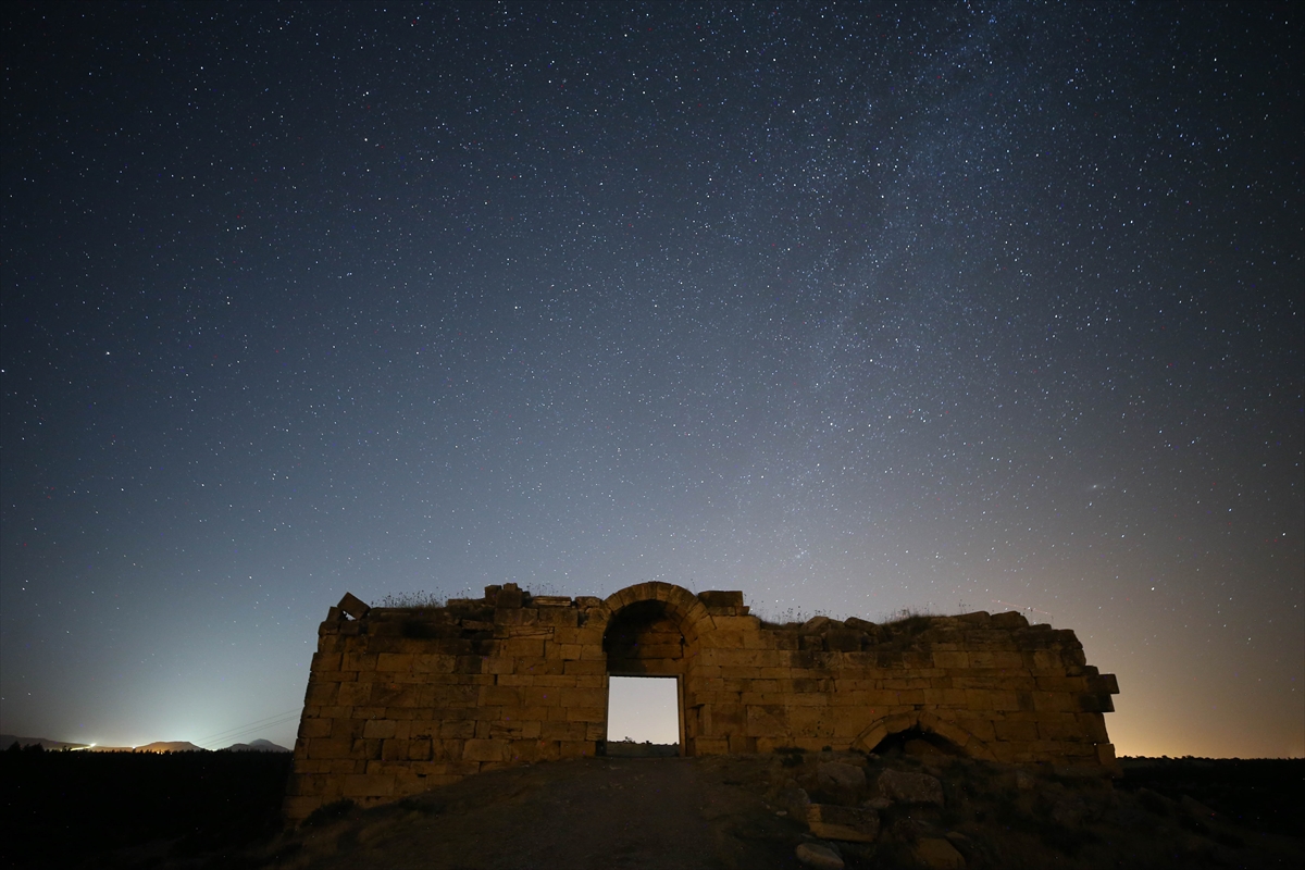 Tek girişinin olmasından dolayı doğal bir kale görümüne sahip Blaundos Antik Kenti'ndeki tarihi yapılar yıldızlarla birlikte güzel görüntü oluşturdu.