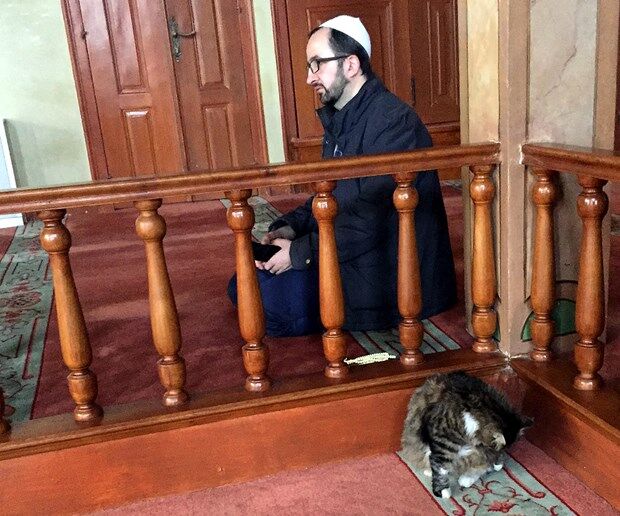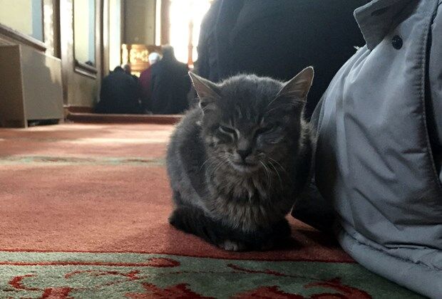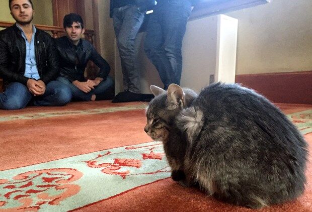 Üsküdar Aziz Mahmud Hüdayi Camisi'ndeki imamlar soğuk kış günlerinde dışarıda kalan kedileri içeriye alıp caminin sıcak ortamını