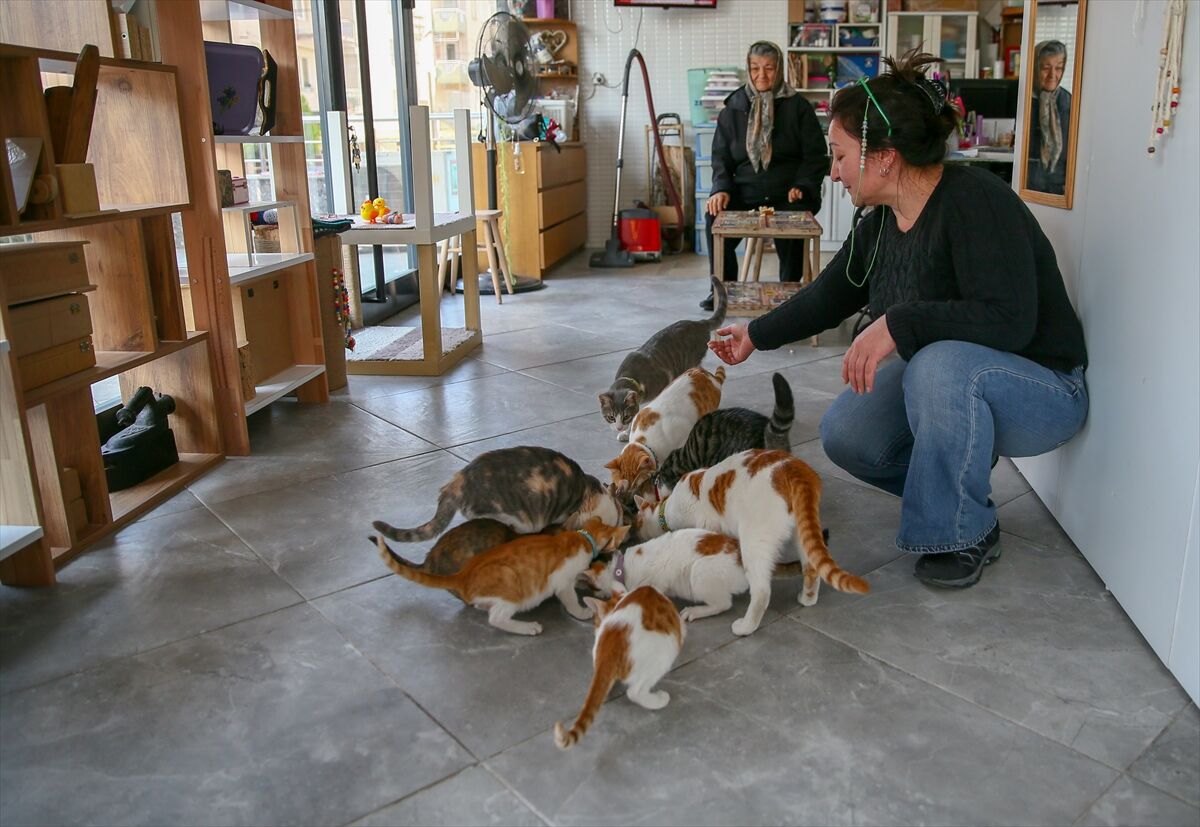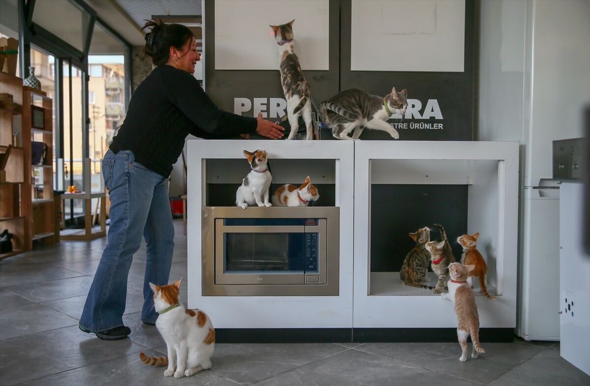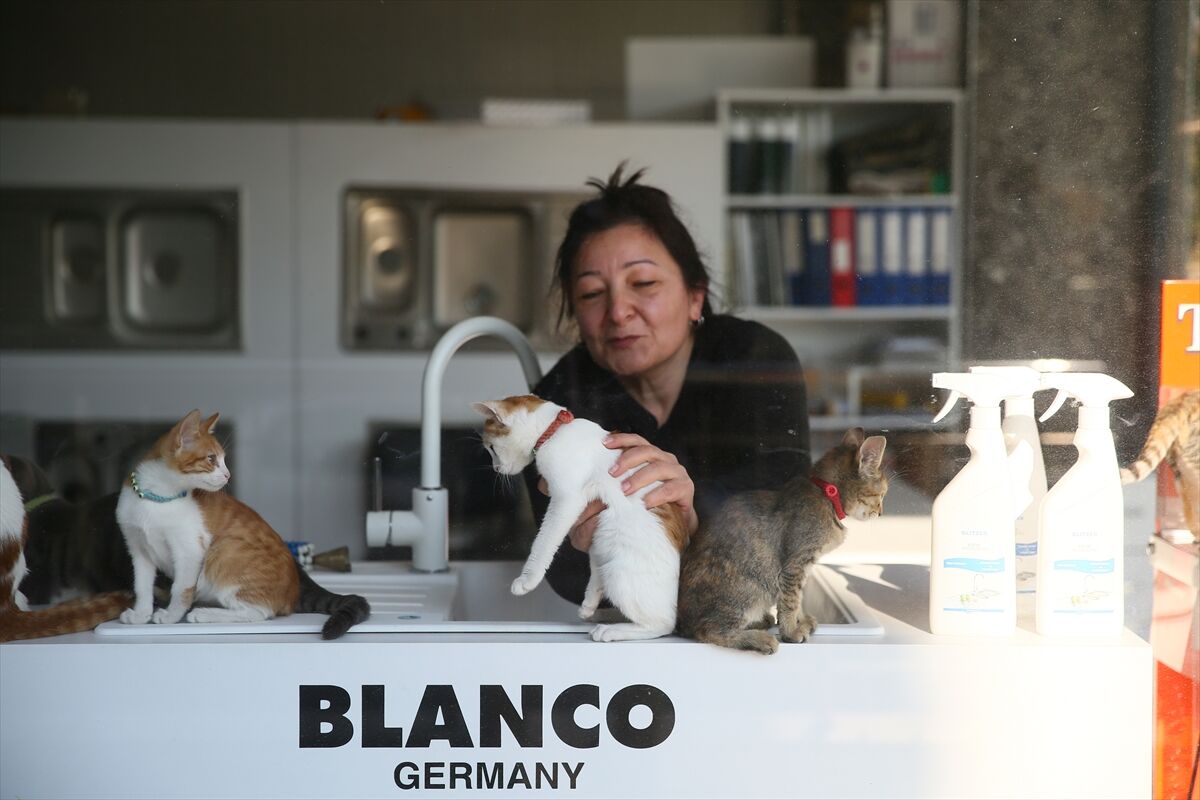 İzmir'in Buca ilçesinde lavabo, batarya gibi ürünleri satan Fatma ve Murat Yıldırım çifti, sahiplendikleri 12 kediye mağazalarında bakıyor.
