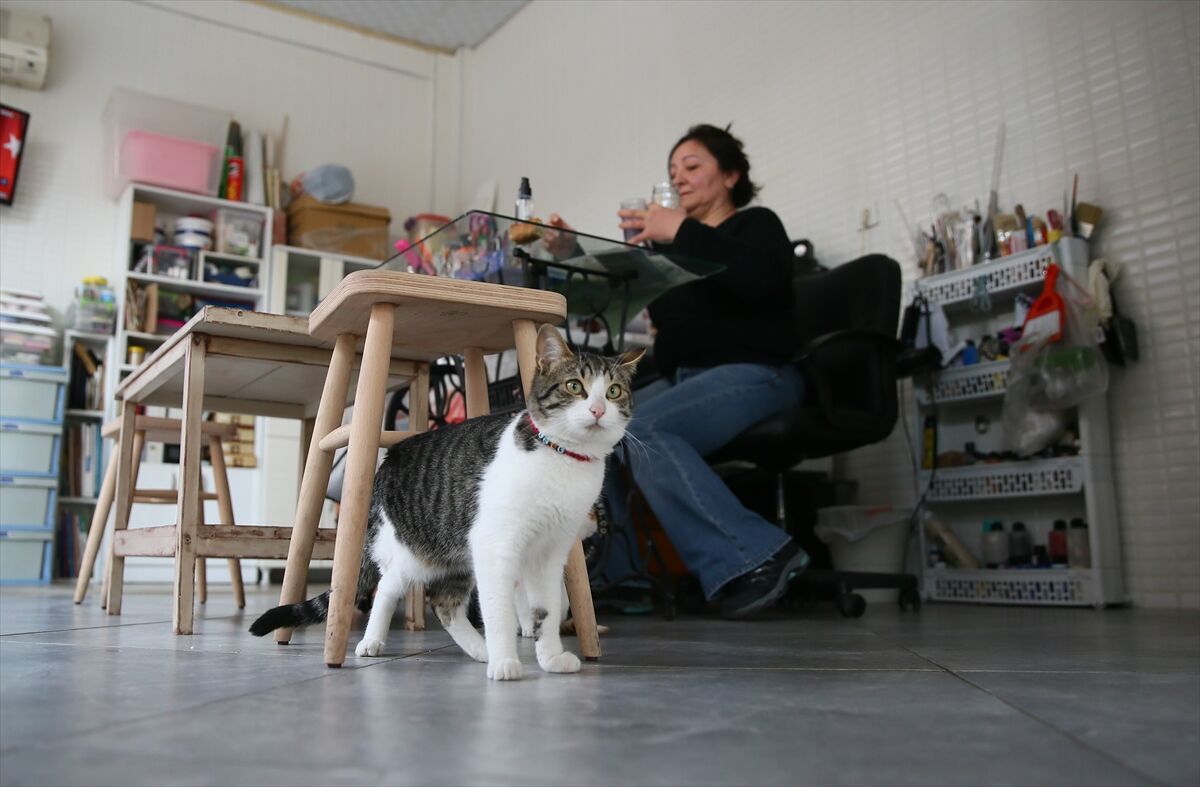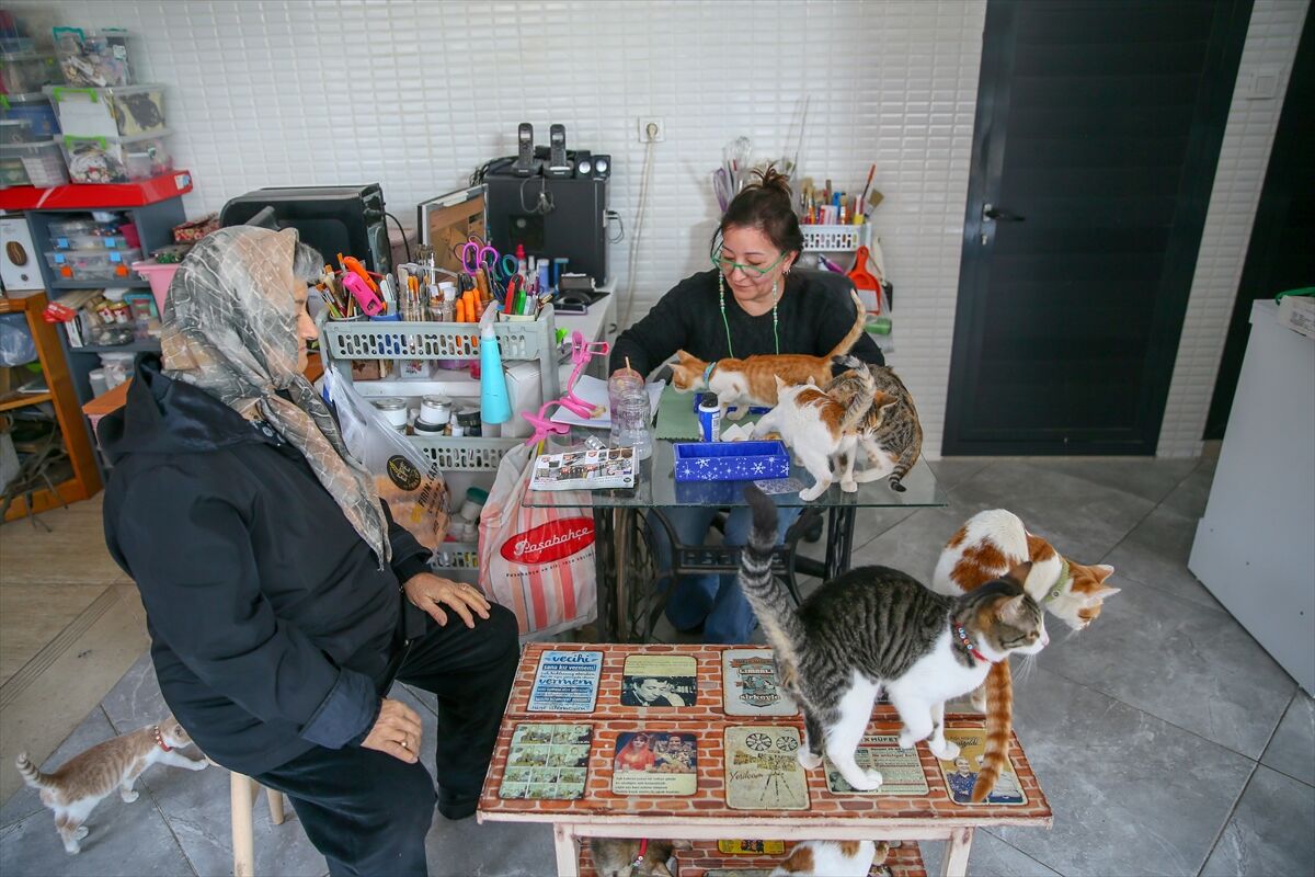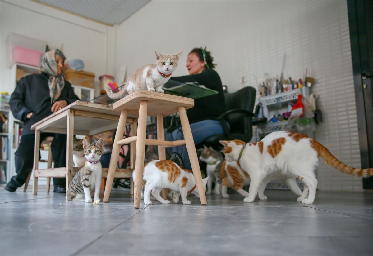 Kedi yavrularını sahiplenen Yıldırım çifti, kedilere mağazalarında bakıyor.