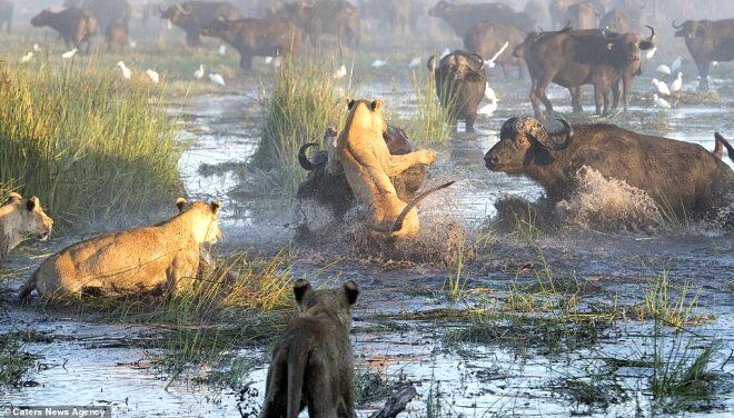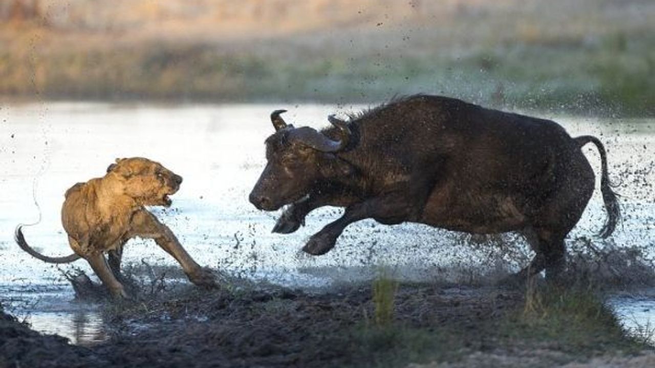 54 yaşındaki Veteriner Hekim Ben Cranke, Güney Afrika'nın Botswana kentinde bulunduğu safari turunda, aslan ve bufalo arasındaki korkunç mücadeleyi fotoğrafladı.