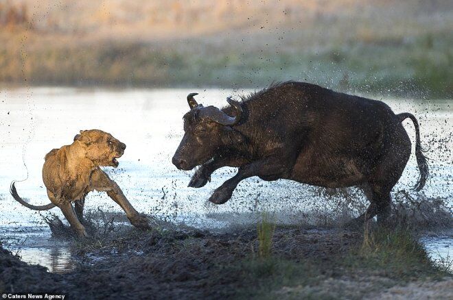 Anne bufalo, yavrusunun canına kasteden dişi aslana korkusuzca saldırırken, Veteriner hekim Cranke bu anları fotoğrafladı.