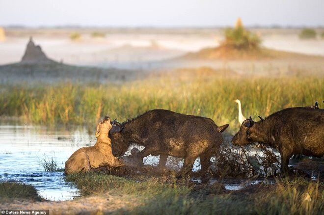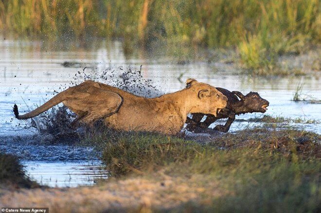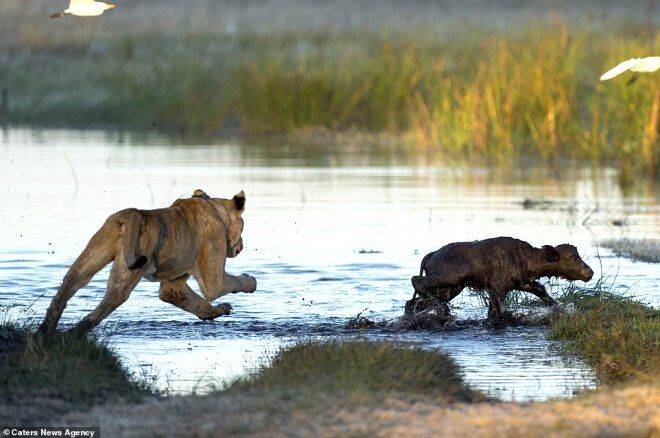 Veteriner hekim Ben Cranke, fotoğrafik safari esnasında yavru bufaloya saldıran, dişi bir aslan gördü ve bu anı ölümsüzleştirmek için fotoğraf makinesine sarıldı.