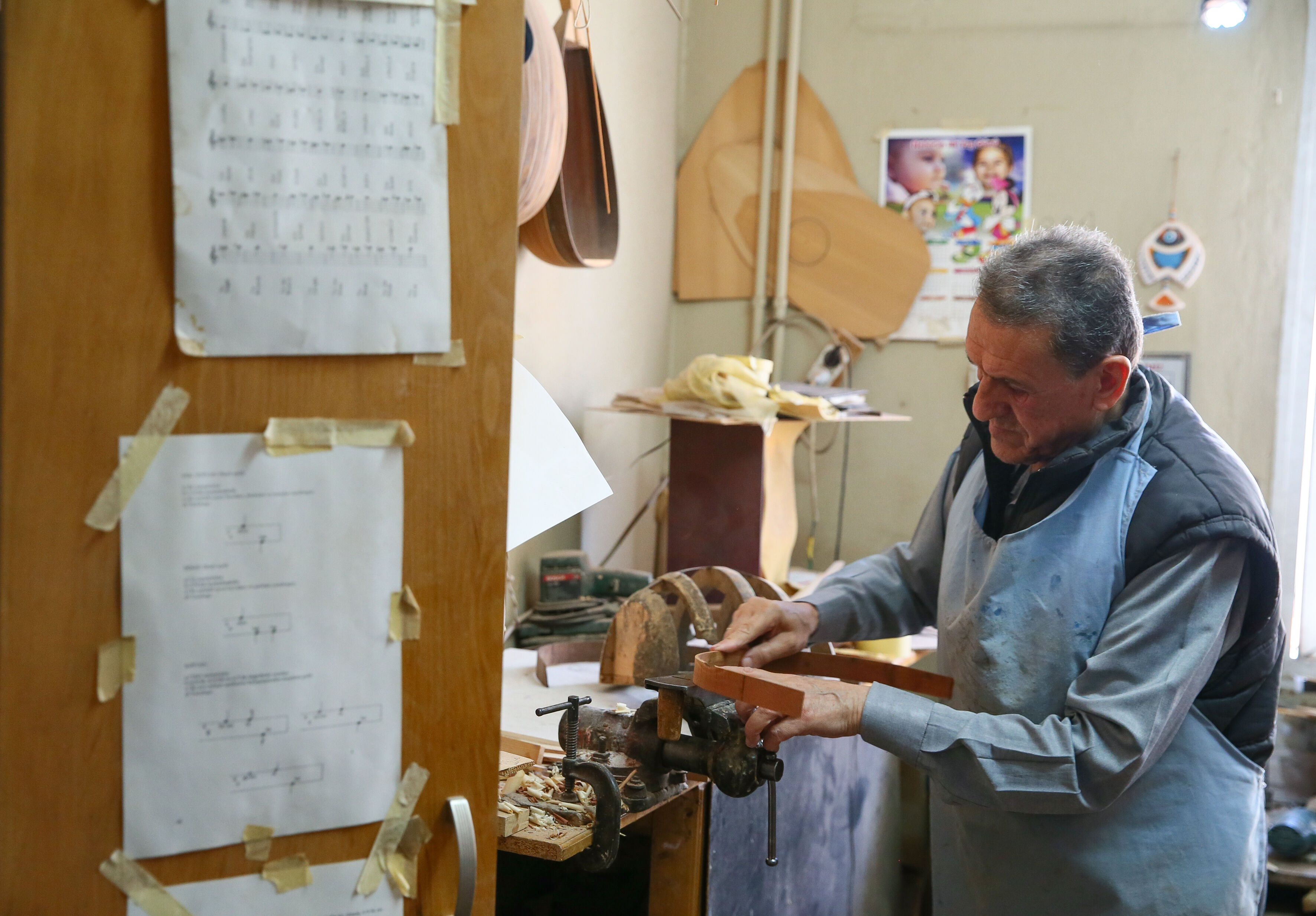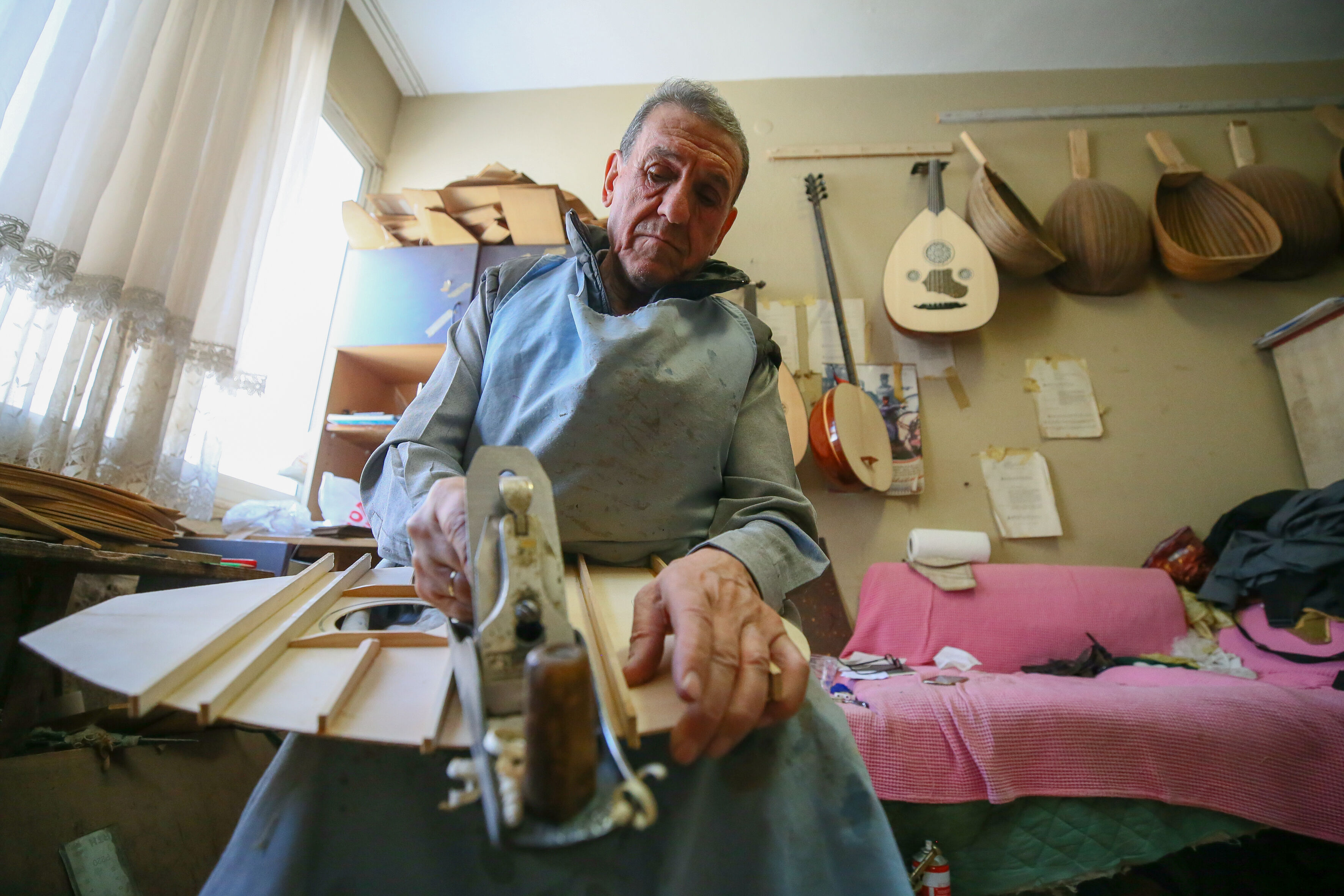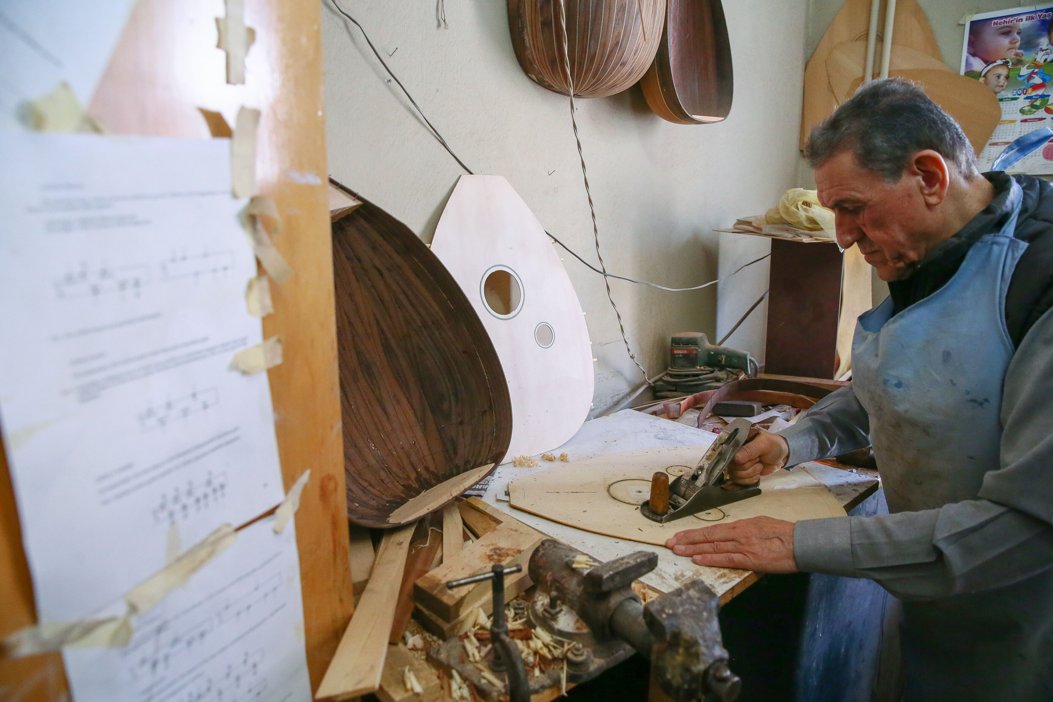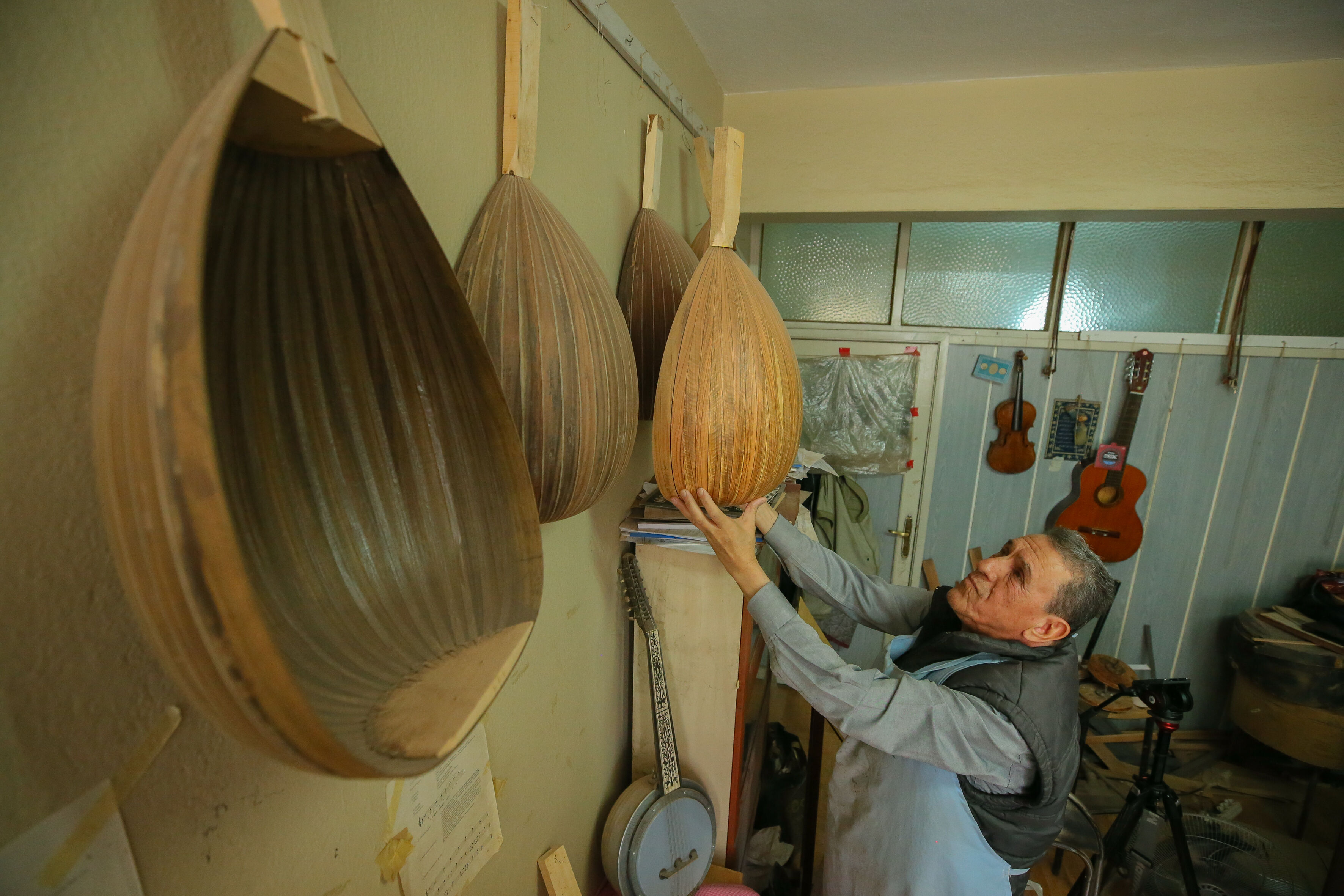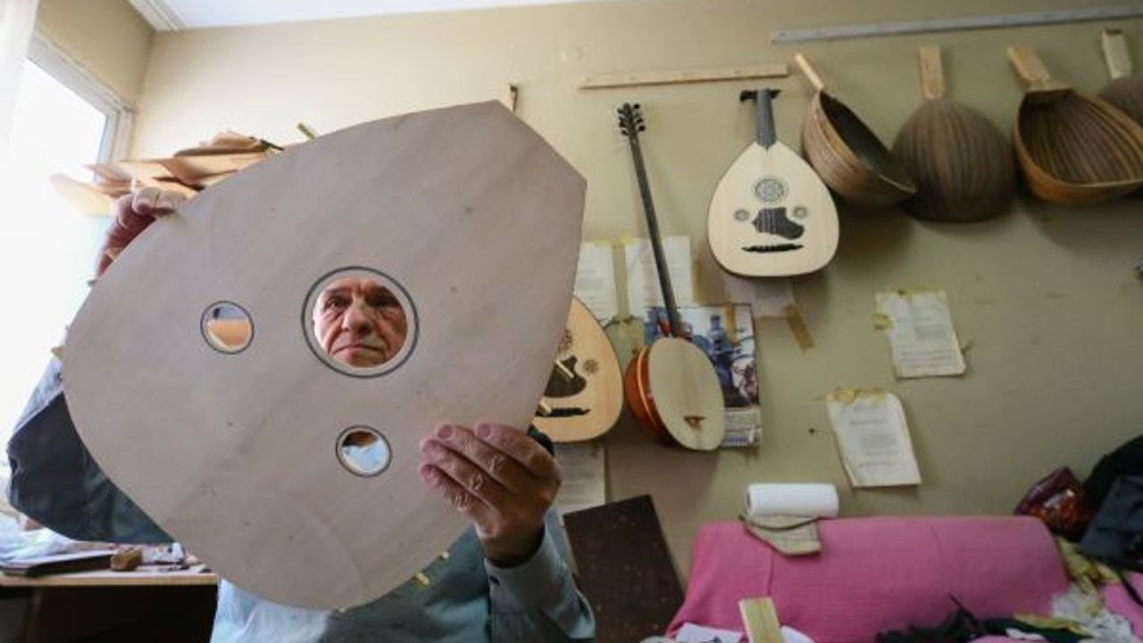 İzmir'de 63 yıldır el yapımı Türk müziği enstrümanları imal eden 72 yaşındaki Nuri Tutpınar, ilerleyen yaşına rağmen "cennetim" diye adlandırdığı atölyesinde ham ağaçları özenle işleyerek ud, tambur, lavtaya dönüştürüyor.
