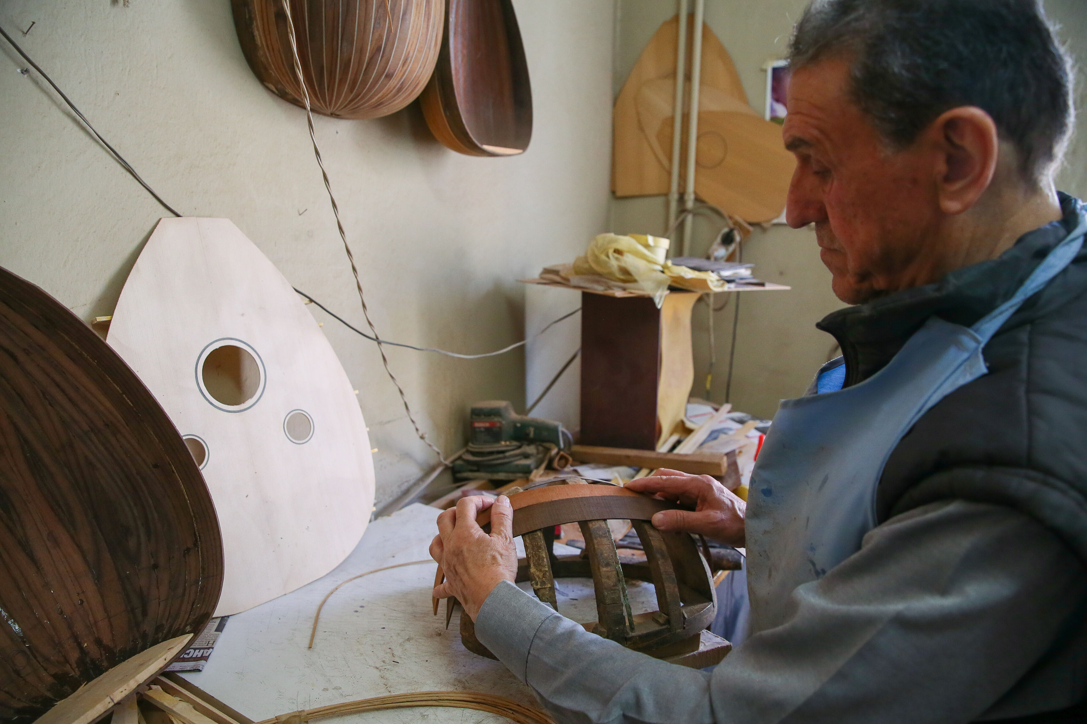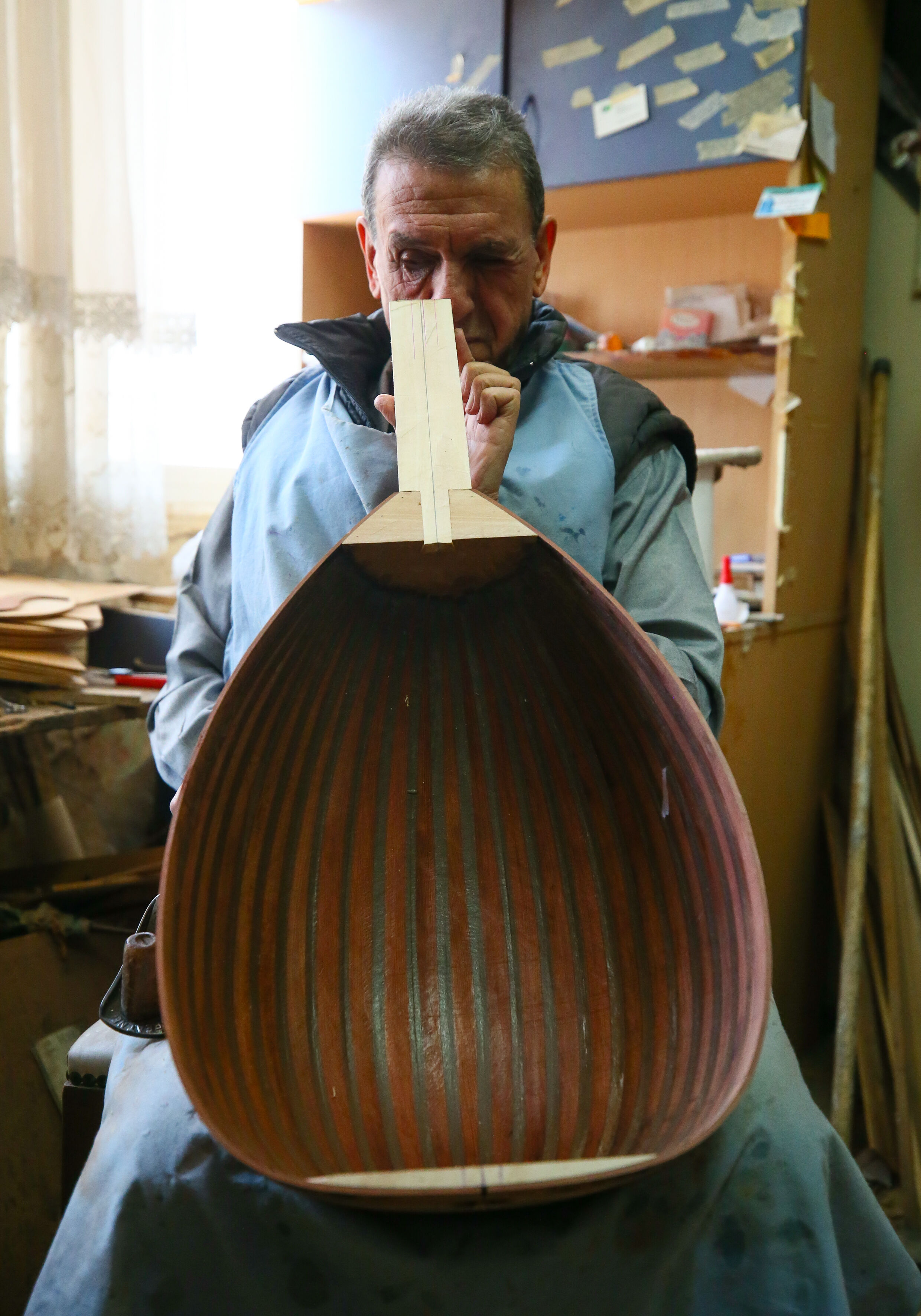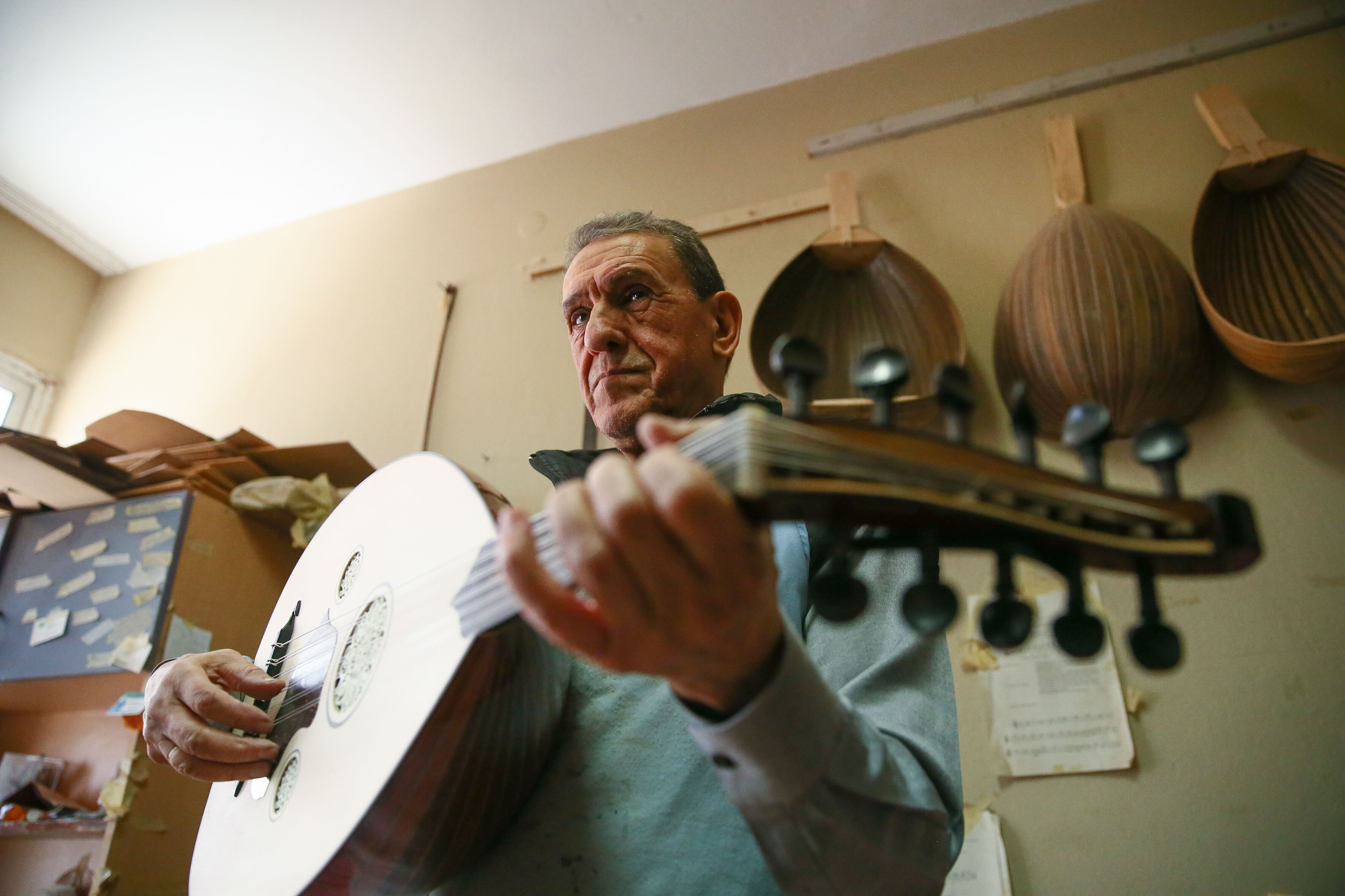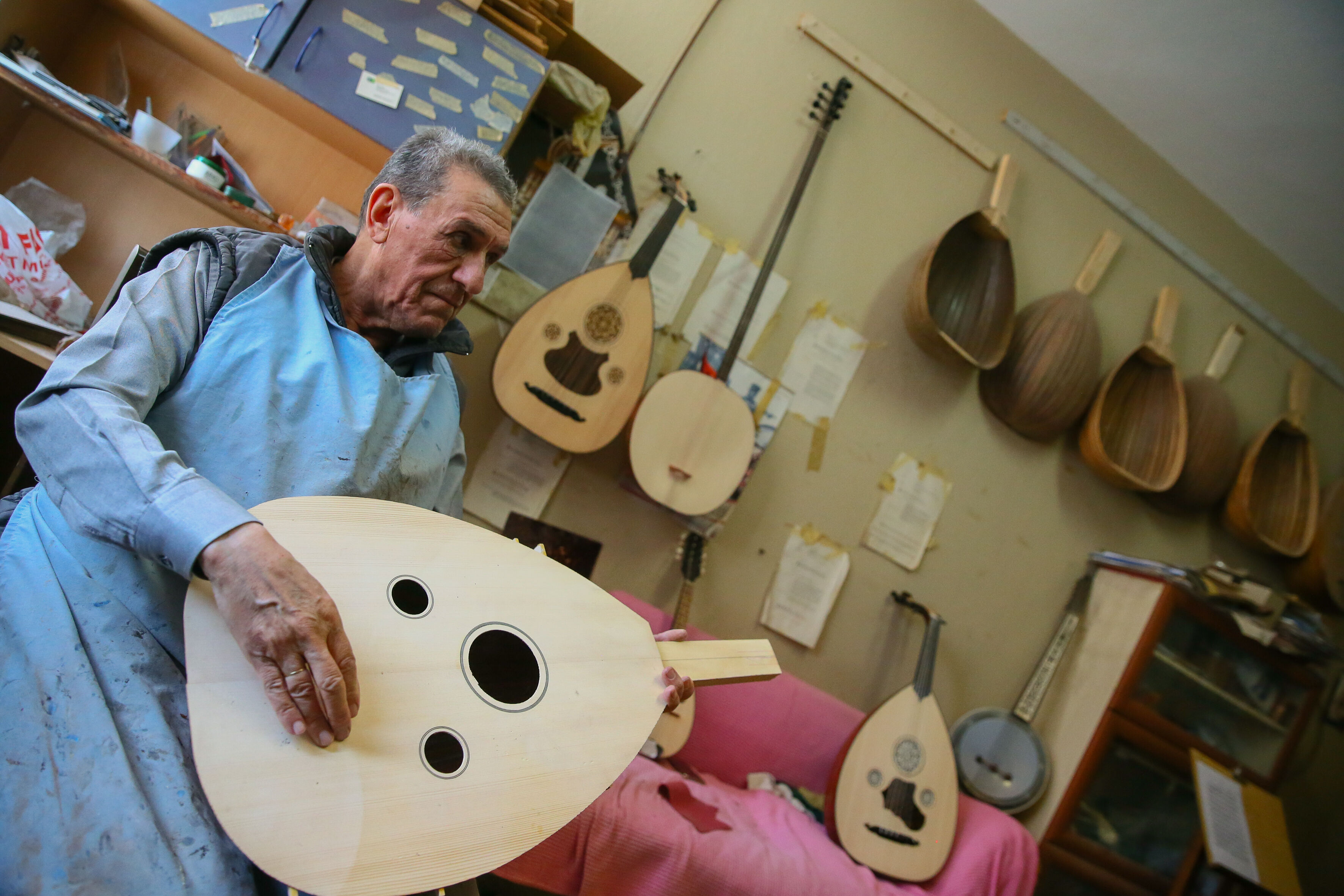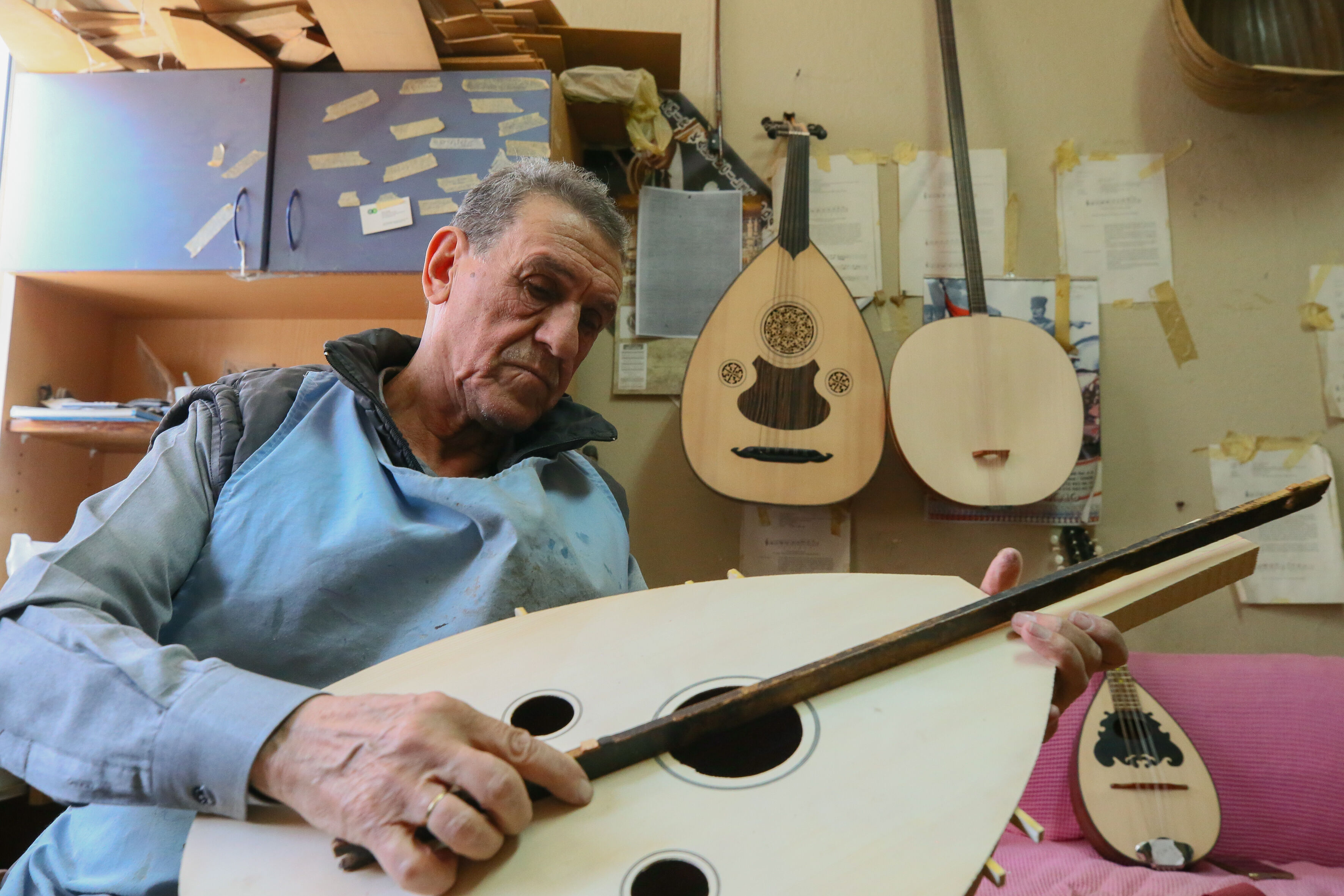 İzmir'de 63 yıldır el yapımı Türk müziği enstrümanları imal eden 72 yaşındaki Nuri Tutpınar, ilerleyen yaşına rağmen "cennetim" diye adlandırdığı atölyesinde ham ağaçları özenle işleyerek ud, tambur, lavtaya dönüştürüyor.